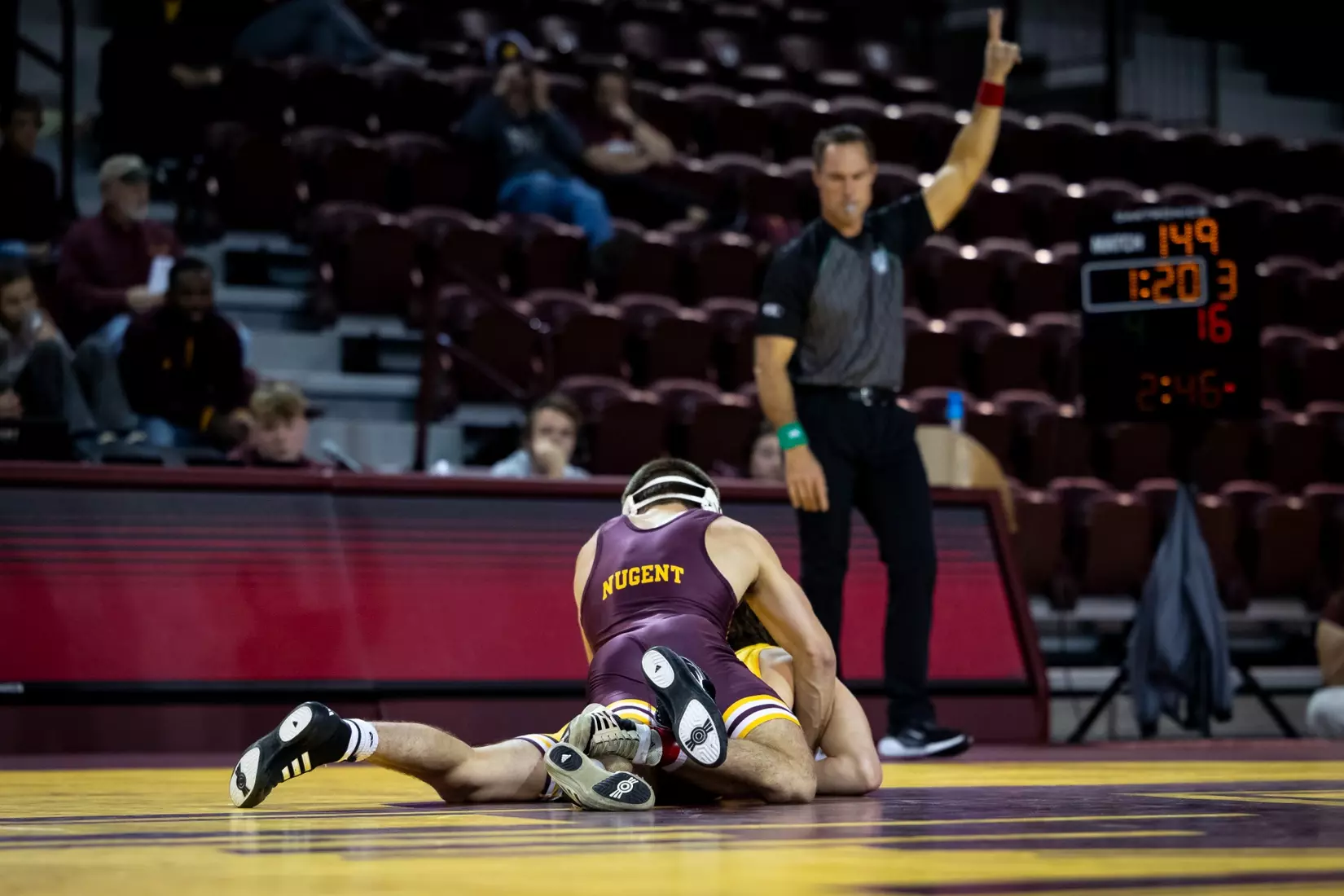 149: Jimmy Nugent (M) major dec. Lane Button, 20-10, Gold 6, Maroon 4