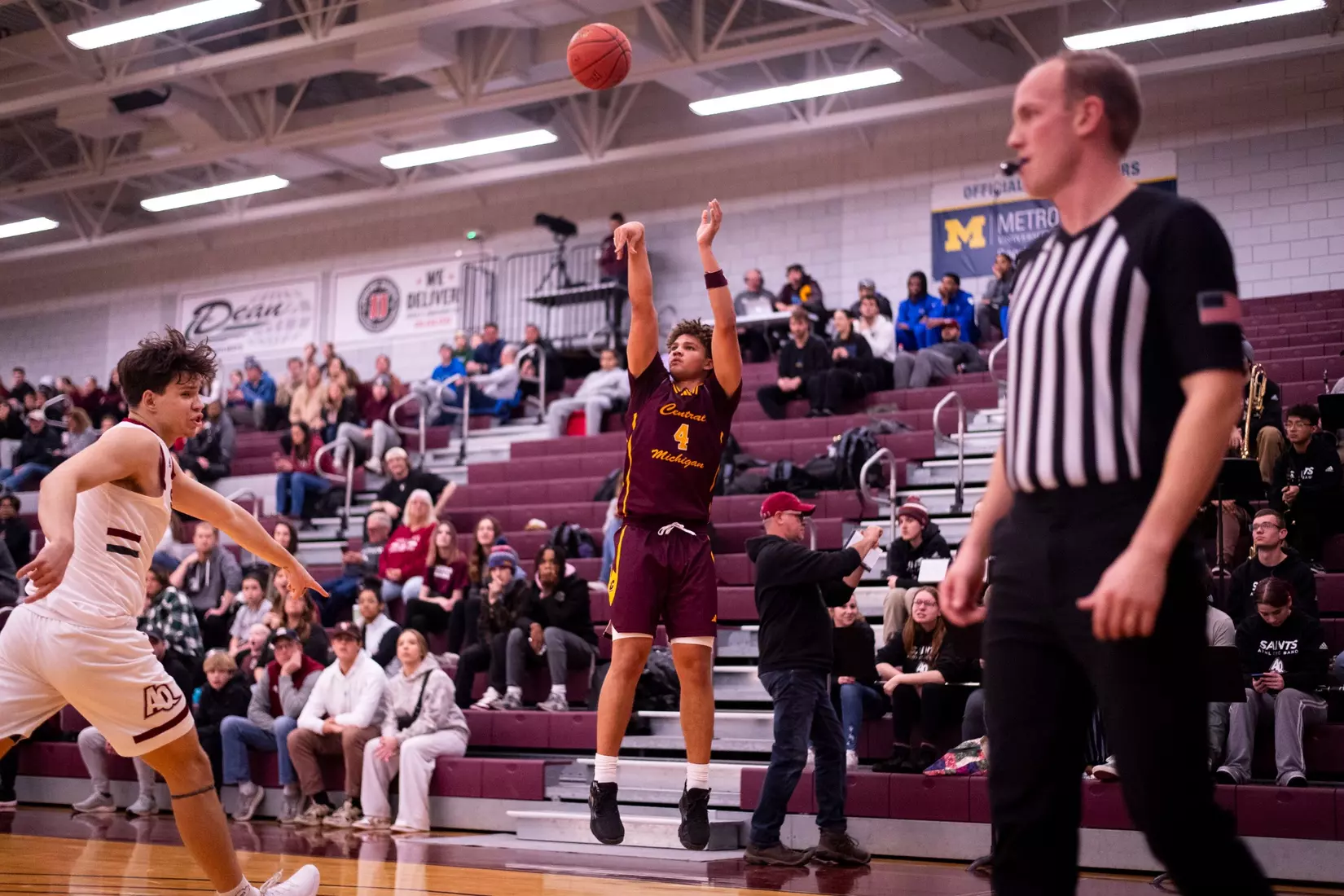 Aquinas hit 10 of its first 16 shots in the game's first 10 minutes. Trailing 10-7, Cayden Vasko hit back-to-back 3-pointers to give Central Michigan a 13-10 lead, But Aquinas went on a 7-0 run fueled by back-to-back layups by Menalito McGree and Jadakiss Lewis, followed by a Tommy Gregwer 3-pointer, which gave Aquinas a 17-13 lead with 13:13 to play in the first half.