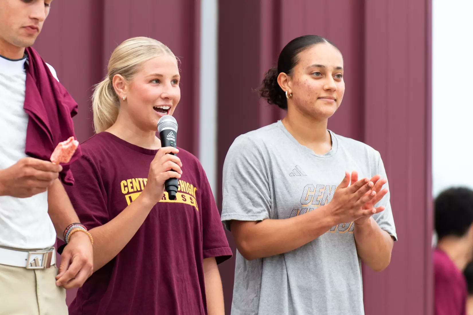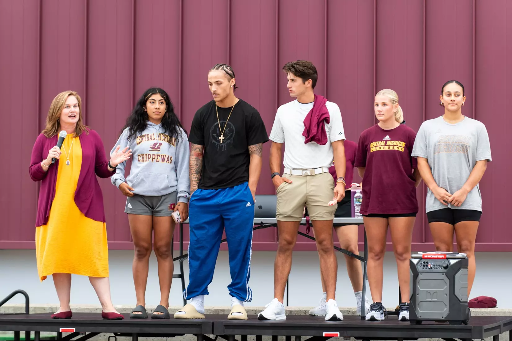CMU President Bob Davies opened the presentation as he fired up the assembled crowd. Zyzelewski Family Vice President/Director of Athletics Amy Folan introduced several student-athletes including women's basketball's Tamara Ortiz, men's basketball's Anthony Pritchard, men's golf's Jeffrey Andrus, lacrosse's Sadie Hinkle, and gymnastics' Luciana Alvarado-Reid and urged fans to attend athletic events.