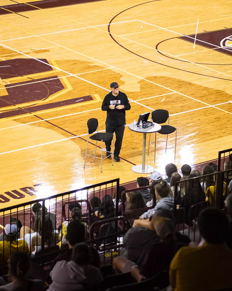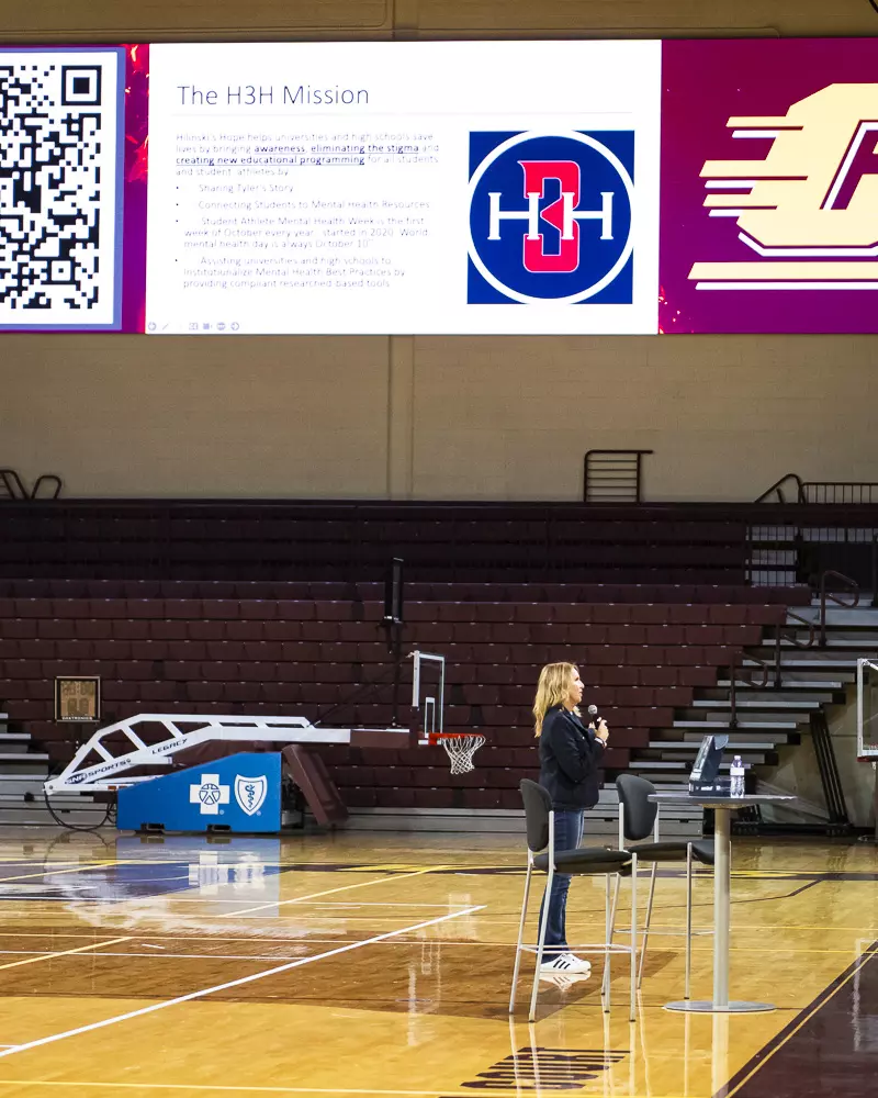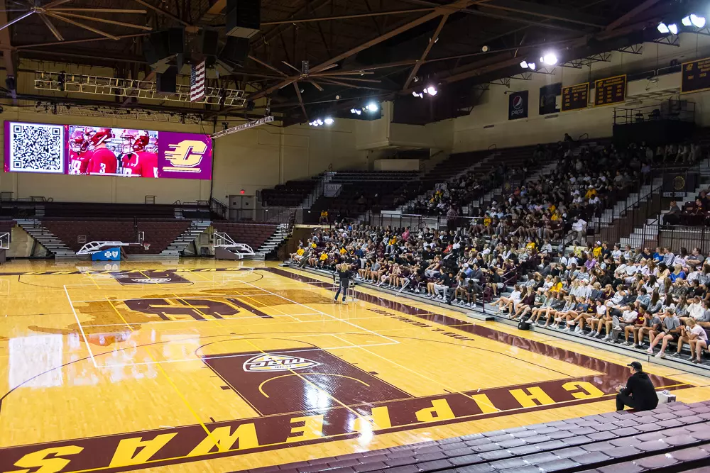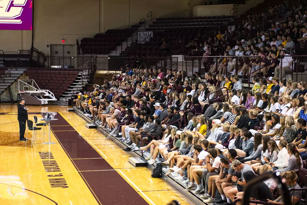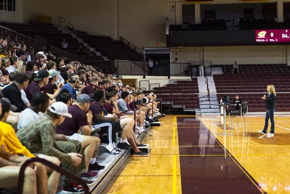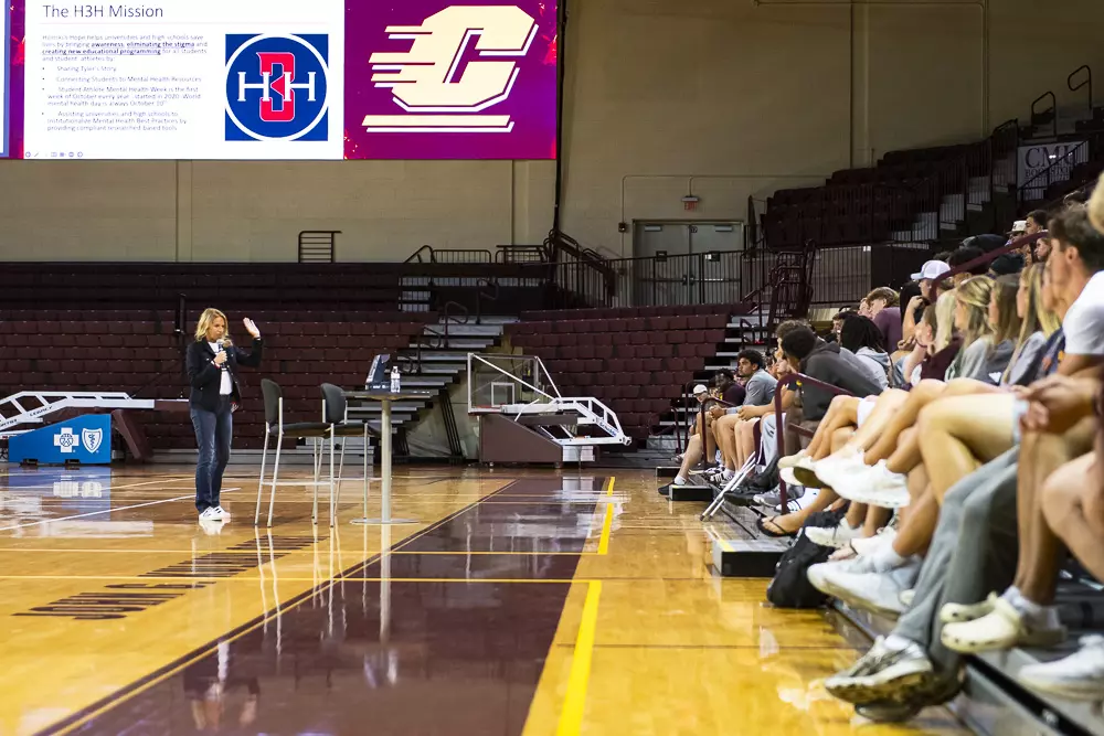 Monday night, Mark and Kym Hilinski visited McGuirk Arena to share the story of their middle son Tyler, a Washington State quarterback, who died by suicide in January 2018. The Hilinskis spoke to the entire group of Central Michigan student-athletes. They have established a foundation Hilinski's Hope, which promotes mental fitness for student-athletes and to tell the story of their son. The impactful and heartbreaking story featured video and photos. Their message to student-athletes: it's okay to seek help and please seek help, you are not alone.