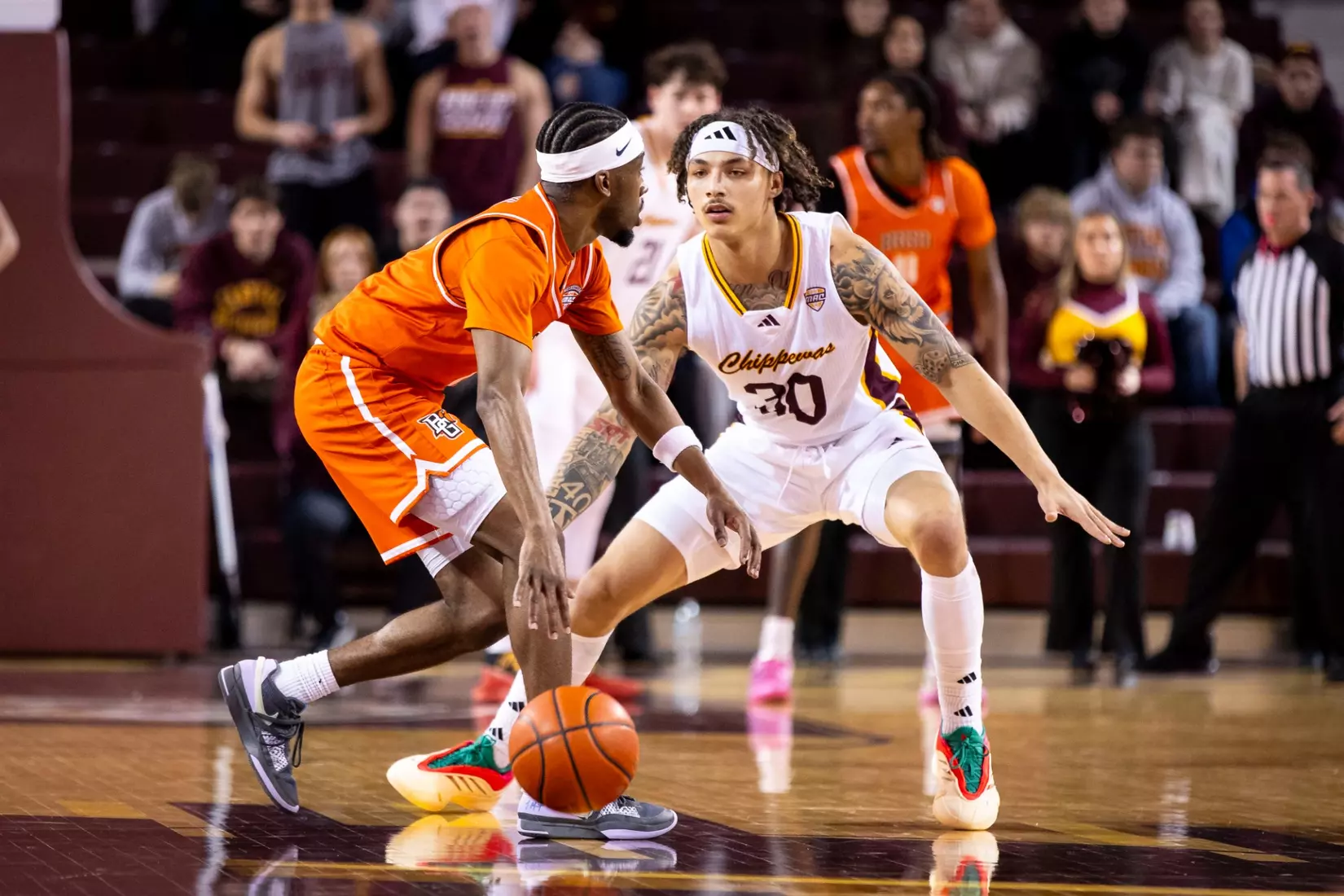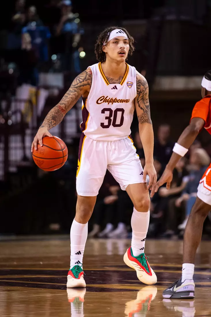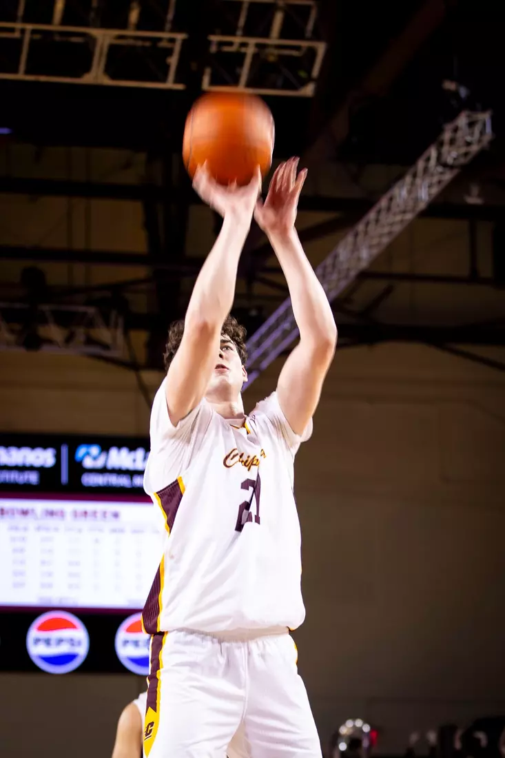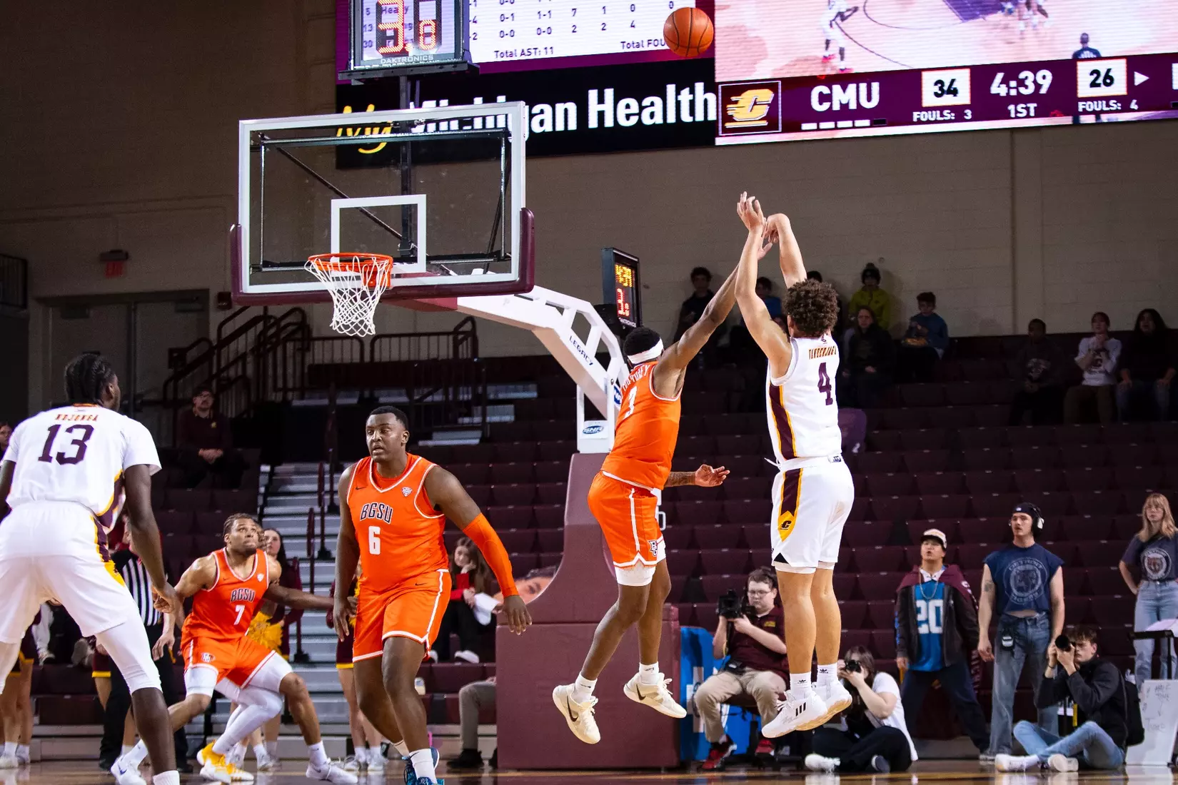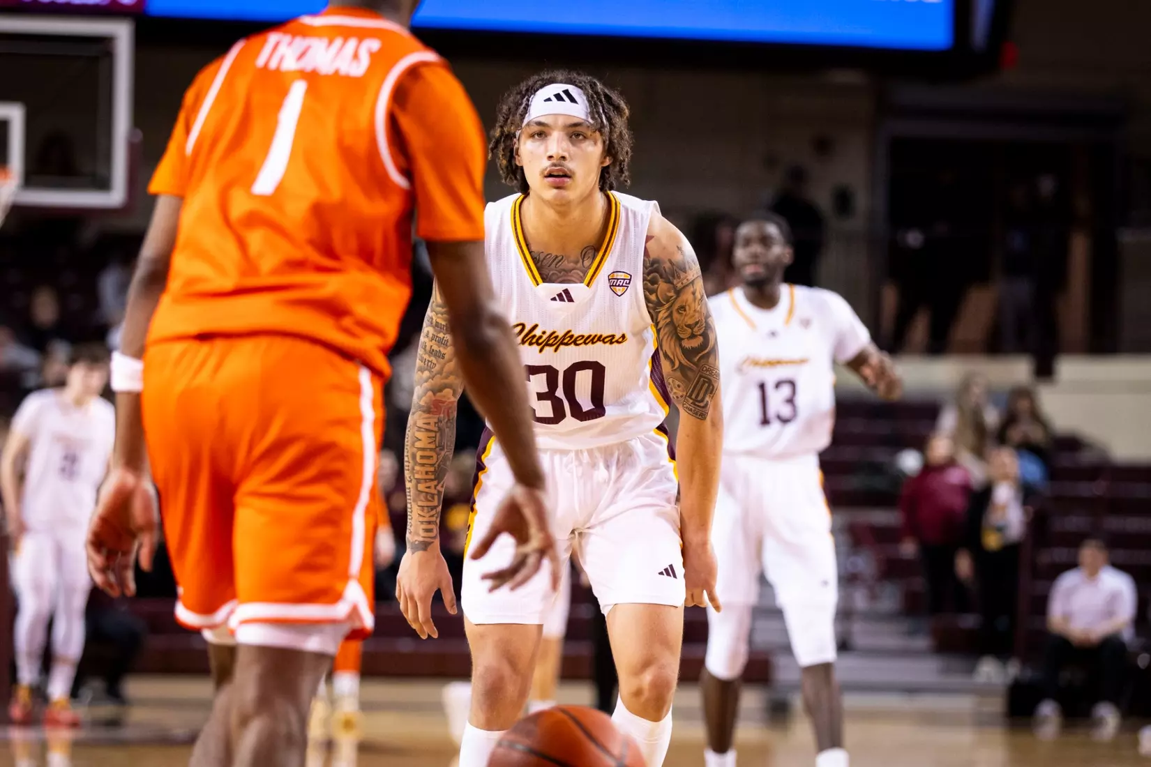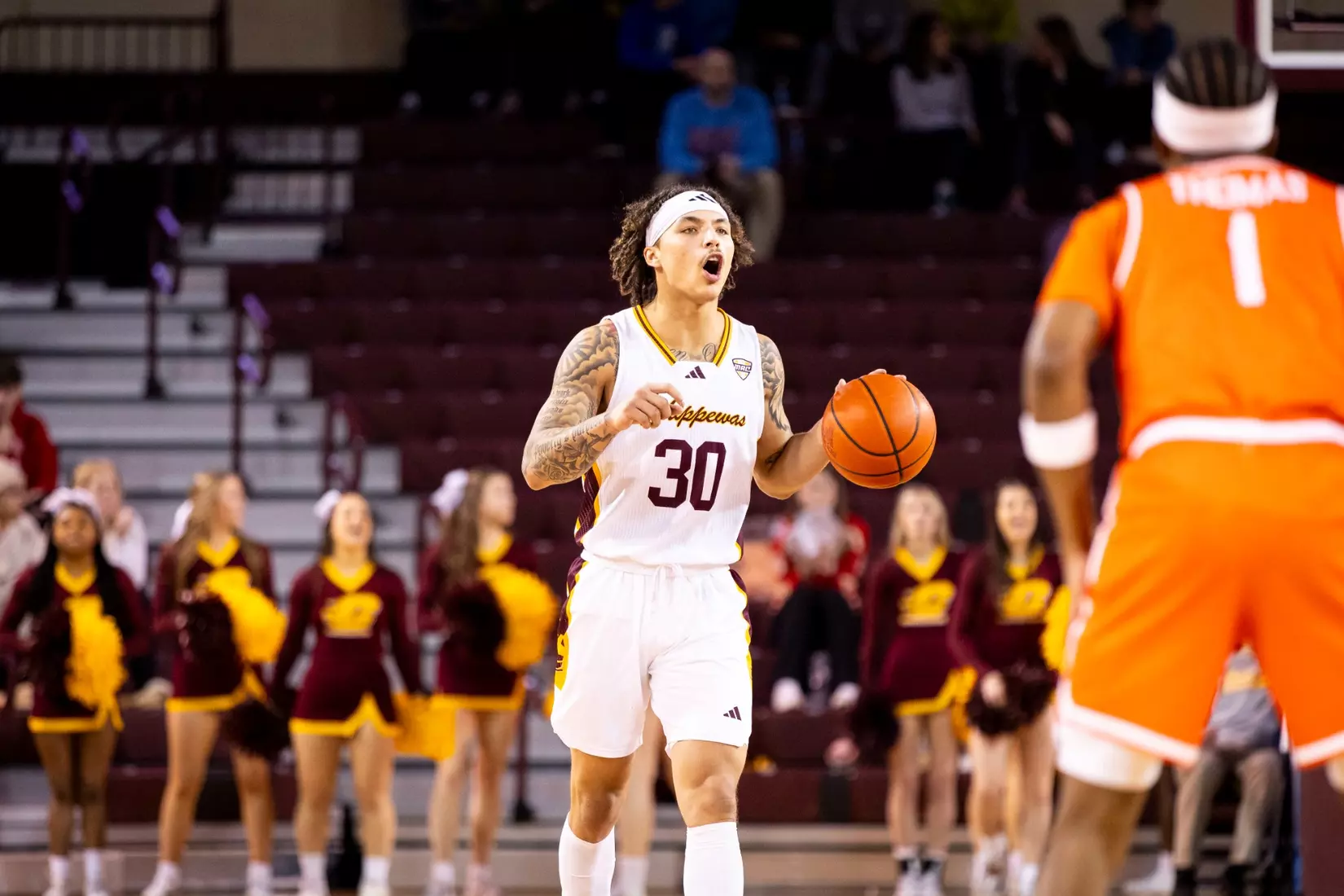 After a back-and-forth first 10 minutes, Central Michigan took the lead for the rest of the half and built a commanding 49-33 halftime lead while shooting 60 percent from the floor. CMU used an 8-0 run to take a 20-12 lead at the 11:28 mark. Cayden Vasko drained a 3-pointer for a 17-12 lead with 12:42 left in the first half, then Quentin Heady finished off a 3-ponit play. The Chippewas pushed their lead back to eight points at 23-15 on a 3-pointer by Kyler VanderJagt.