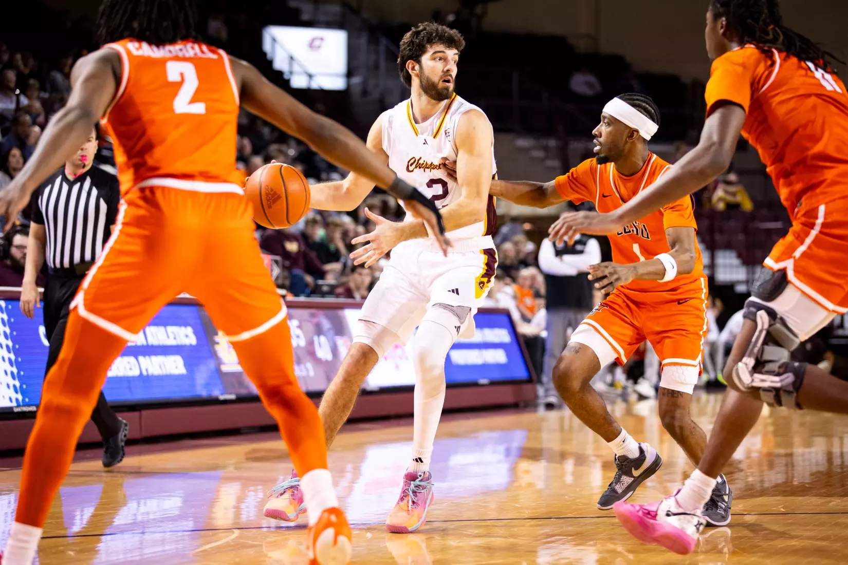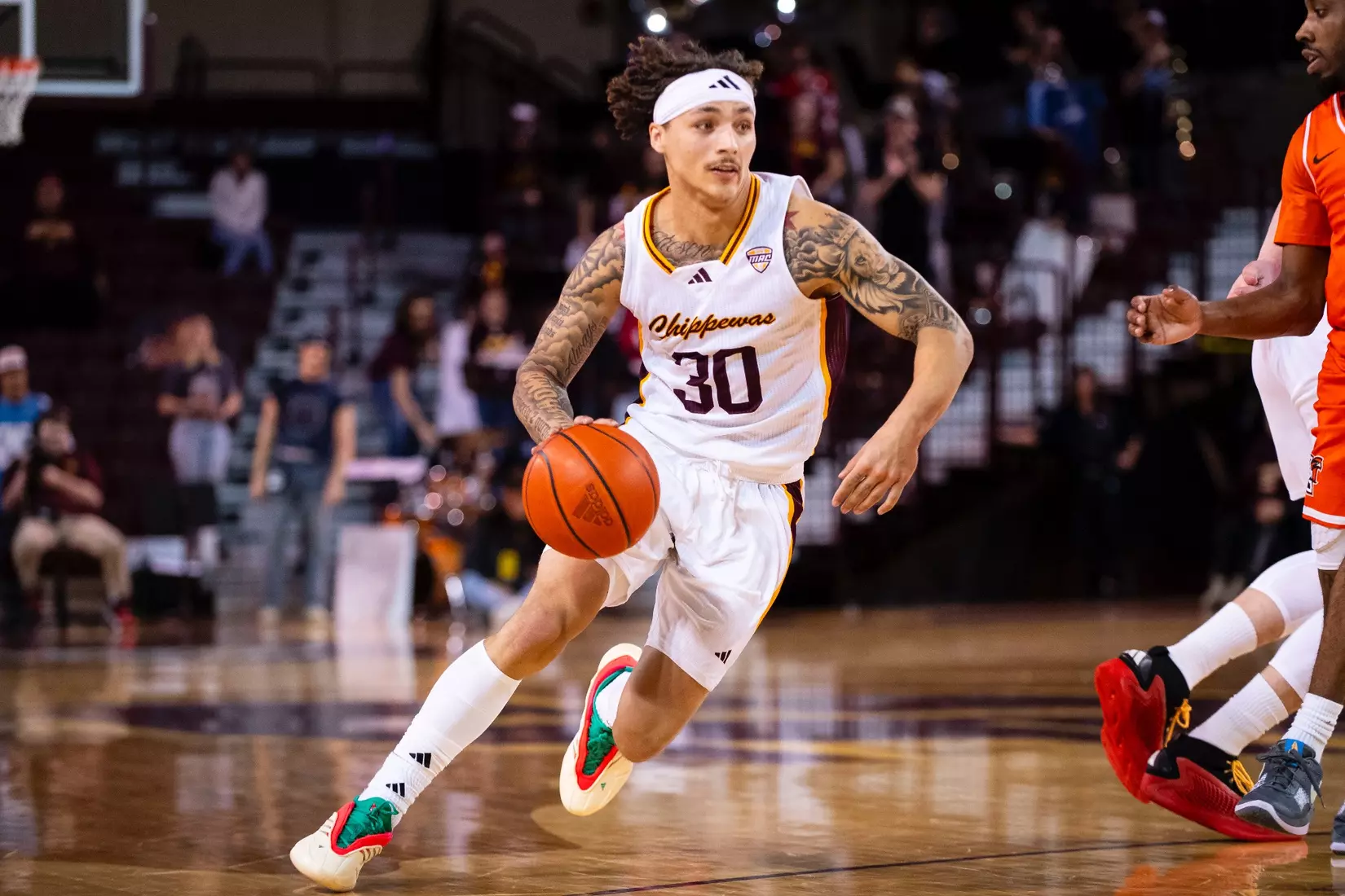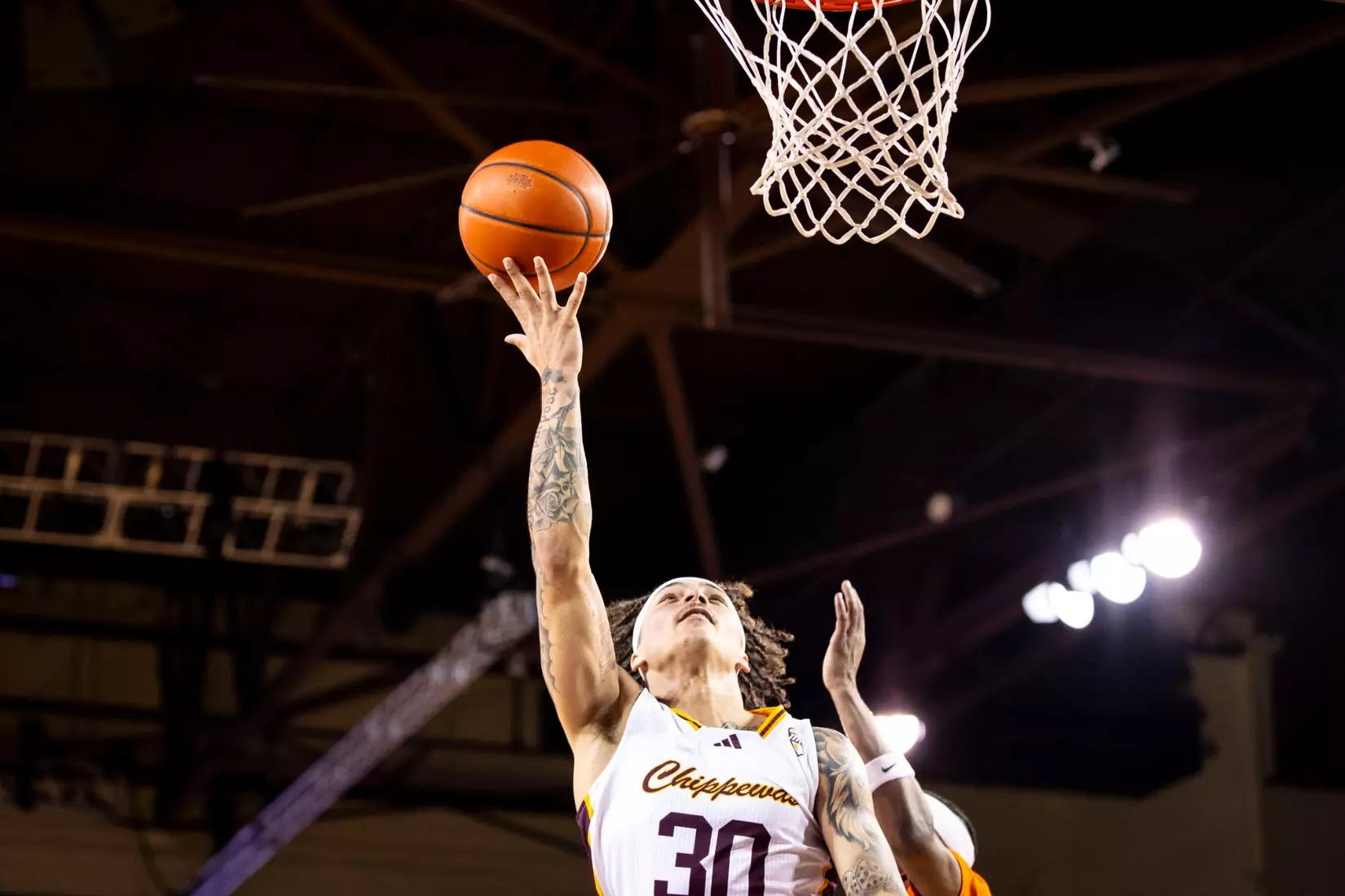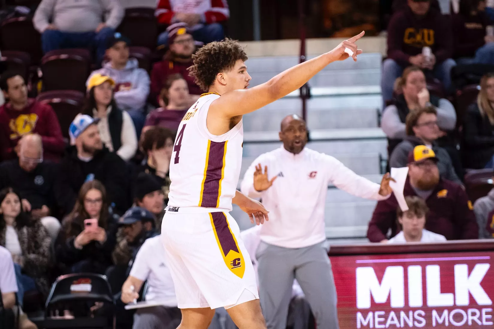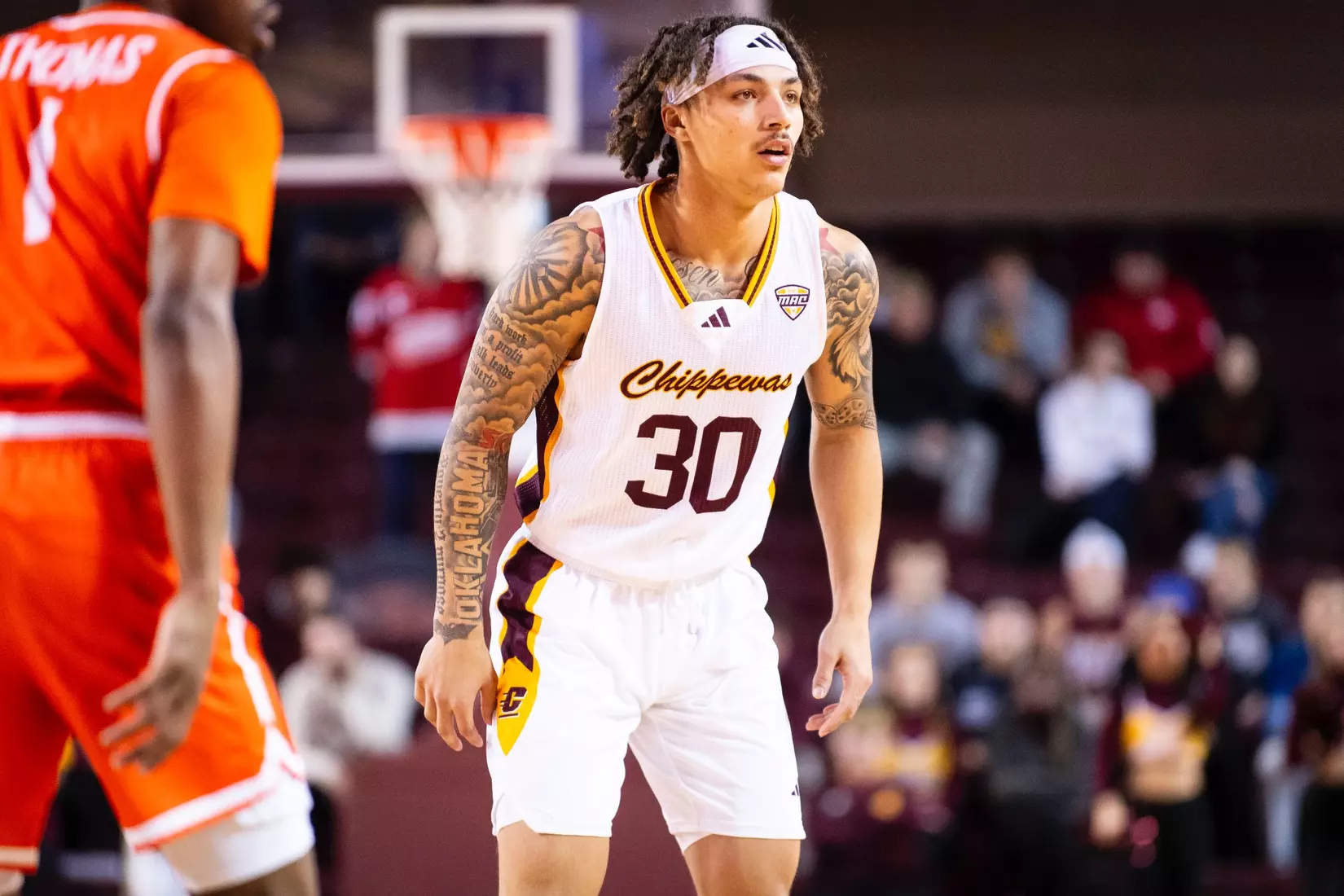 After a back-and-forth first 10 minutes, Central Michigan took the lead for the rest of the half and built a commanding 49-33 halftime lead while shooting 60 percent from the floor. CMU used an 8-0 run to take a 20-12 lead at the 11:28 mark. Cayden Vasko drained a 3-pointer for a 17-12 lead with 12:42 left in the first half, then Quentin Heady finished off a 3-ponit play. The Chippewas pushed their lead back to eight points at 23-15 on a 3-pointer by Kyler VanderJagt.
