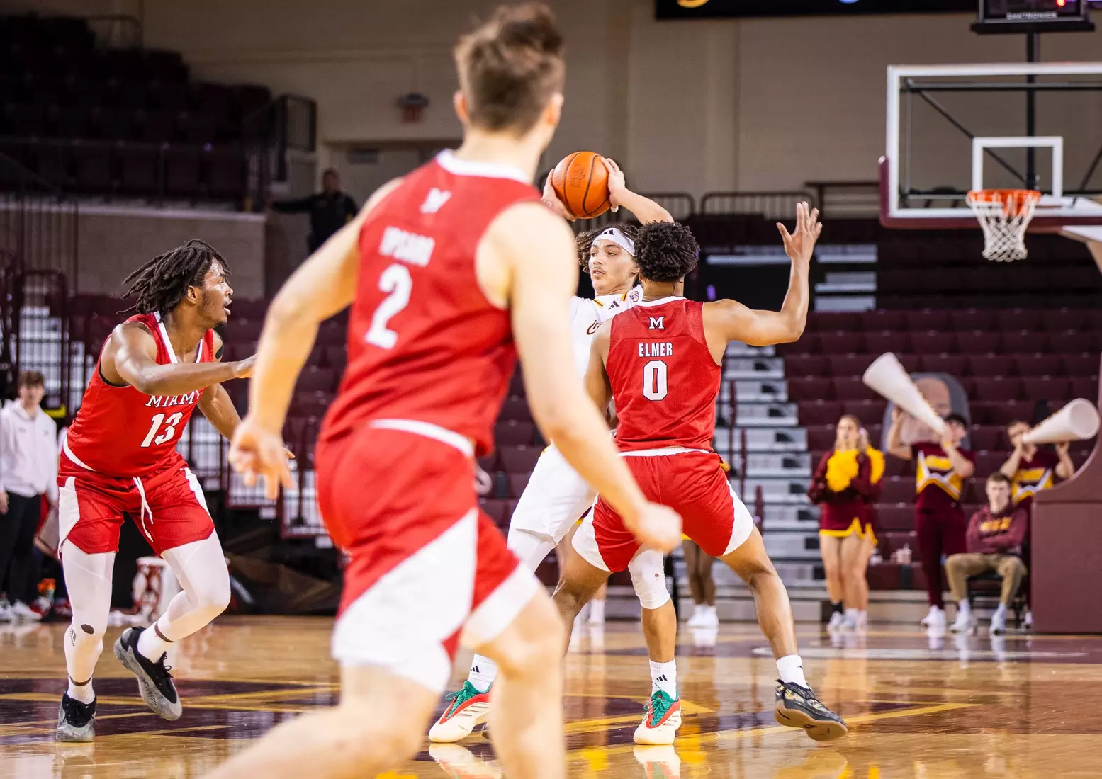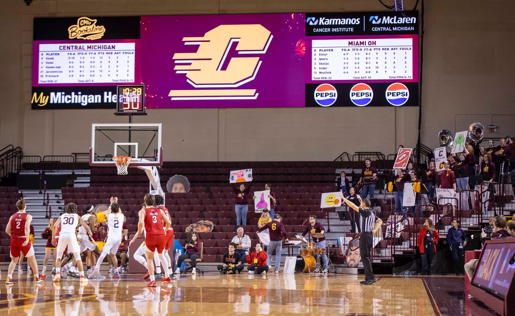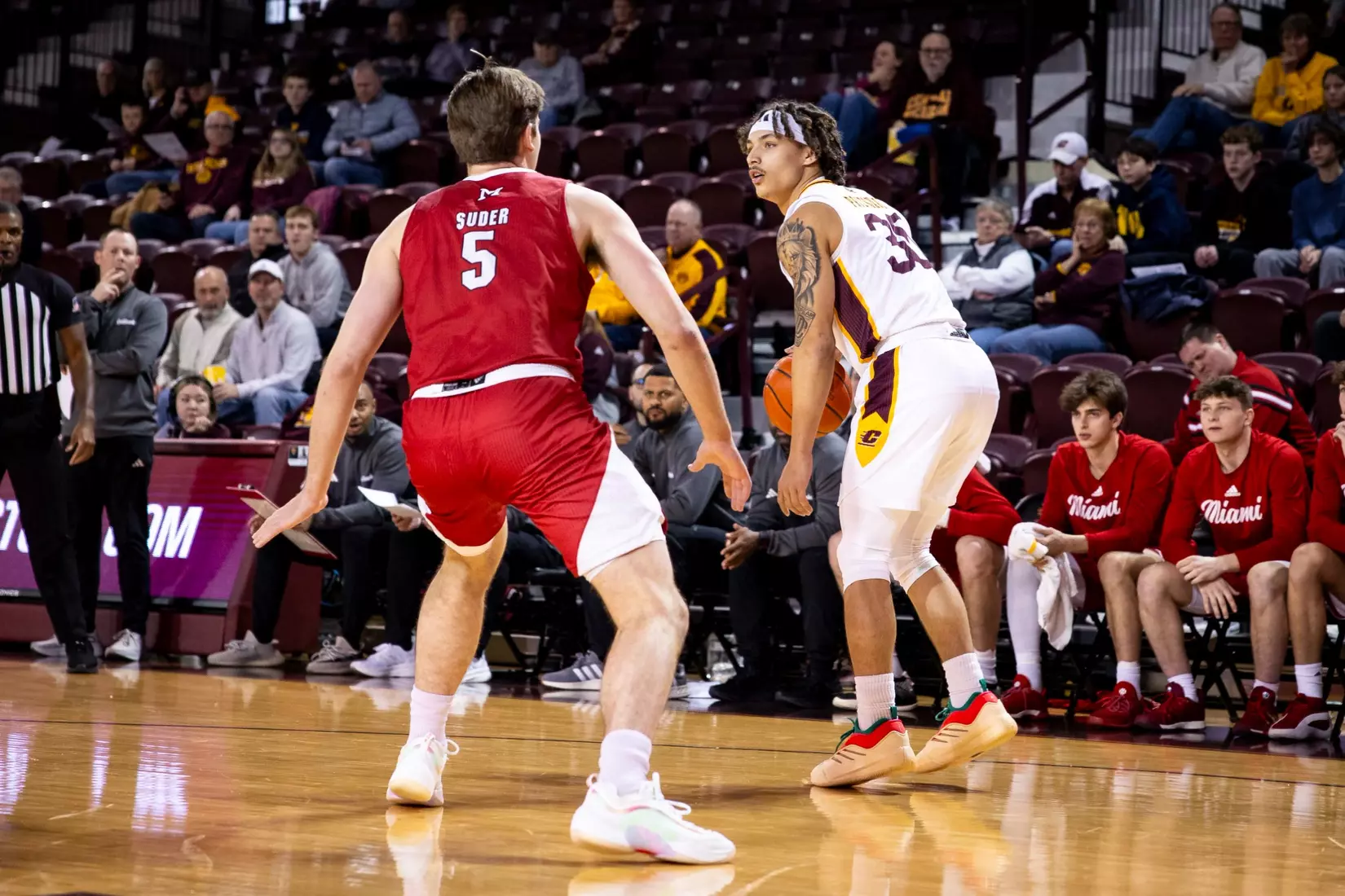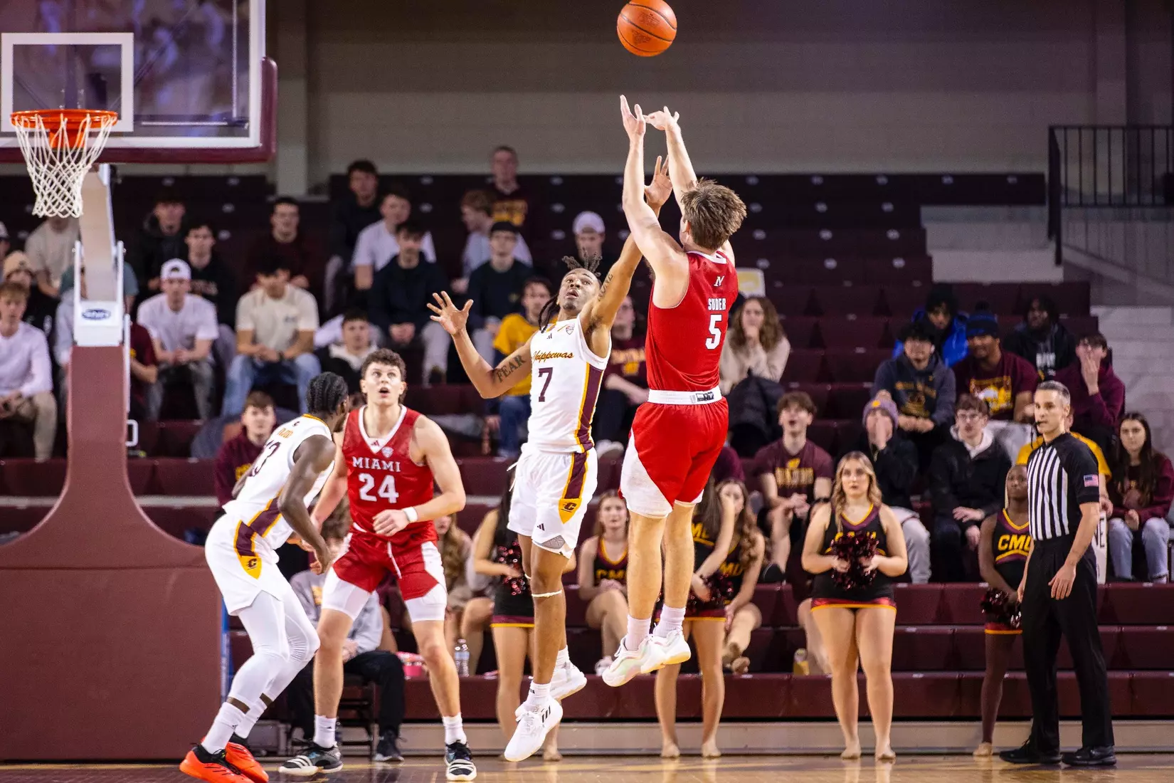 The second stretch was after Central Michigan battled back to tie the score at 68-68 with several 3-pointers by Damarion Bonds with 3:19 to play. Miami went on a 6-0 run to take a commanding 74-68 lead with 17 seconds to play. In the run, Brant Byers converted two free throws, and after a CMU turnover, Eian Elmer converted a free throw for a three-point lead. Following a CMU missed shot and turnover, Suder was fouled and hit two free throws for a five-point lead. After CMU missed another shot, Miami's Evan Ipsaro added another free throw for the 74-68 advantage.