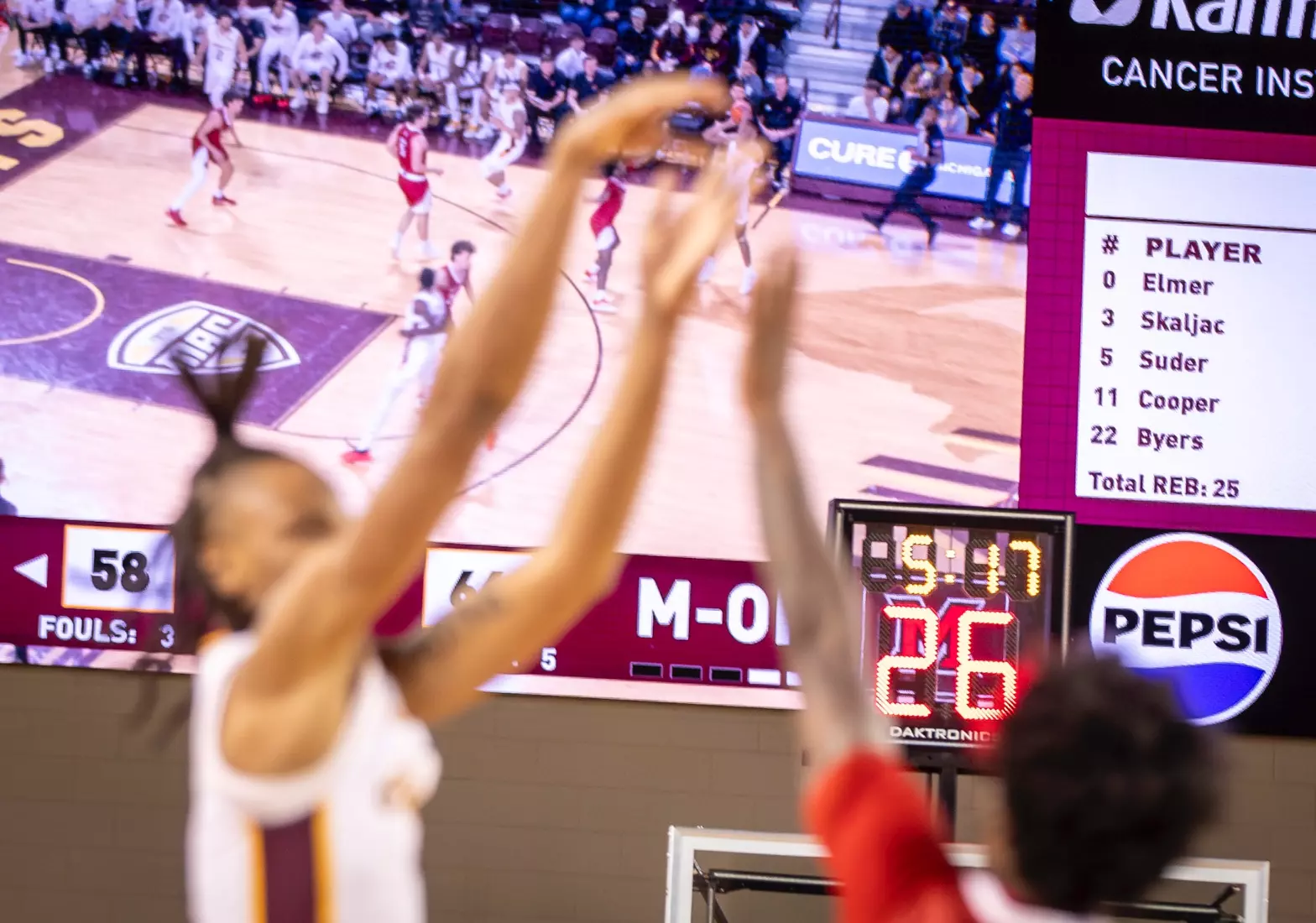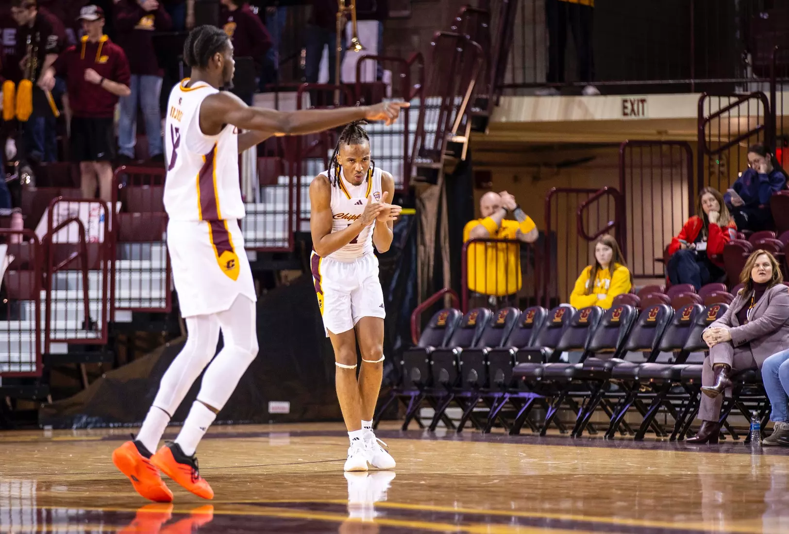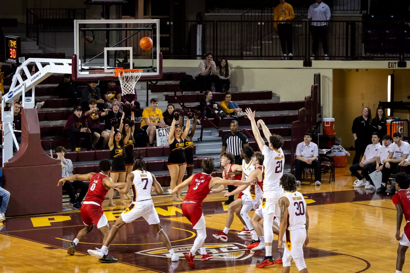 The second stretch was after Central Michigan battled back to tie the score at 68-68 with several 3-pointers by Damarion Bonds with 3:19 to play. Miami went on a 6-0 run to take a commanding 74-68 lead with 17 seconds to play. In the run, Brant Byers converted two free throws, and after a CMU turnover, Eian Elmer converted a free throw for a three-point lead. Following a CMU missed shot and turnover, Suder was fouled and hit two free throws for a five-point lead. After CMU missed another shot, Miami's Evan Ipsaro added another free throw for the 74-68 advantage.