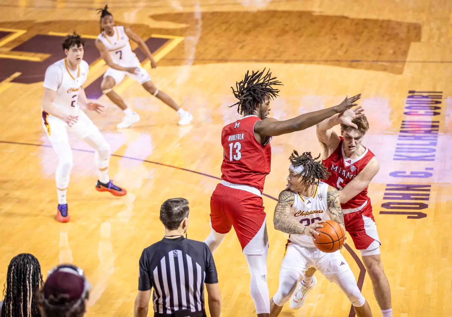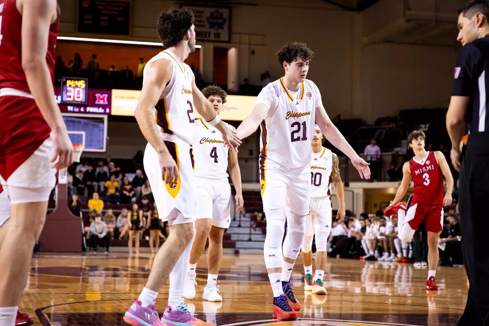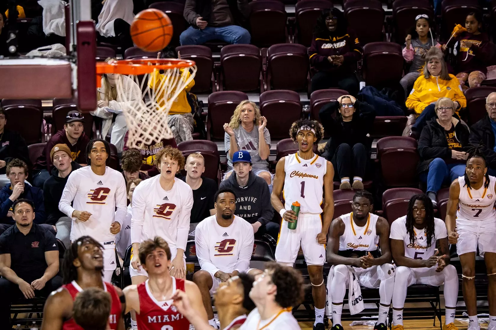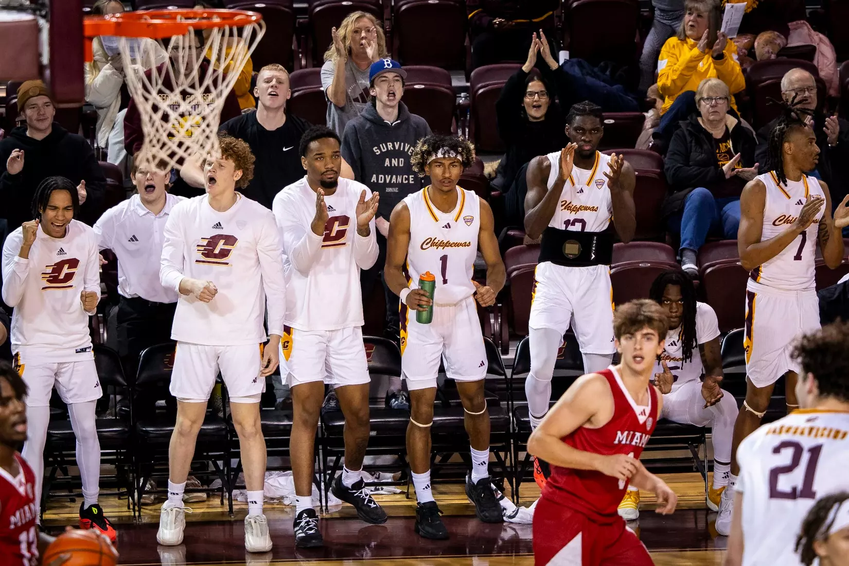 The first stretch was early in the second half when Central Michigan gained all the momentum with a 10-3 run to build a five-point lead at the 15:37 mark. But Miami forced the Chippewas into missing several shots and minutes later outscored CMU 9-2 with two 3-pointers from Luke Skaljac and a free throw to go back up by six points, 55-49 at the 10:28 mark.