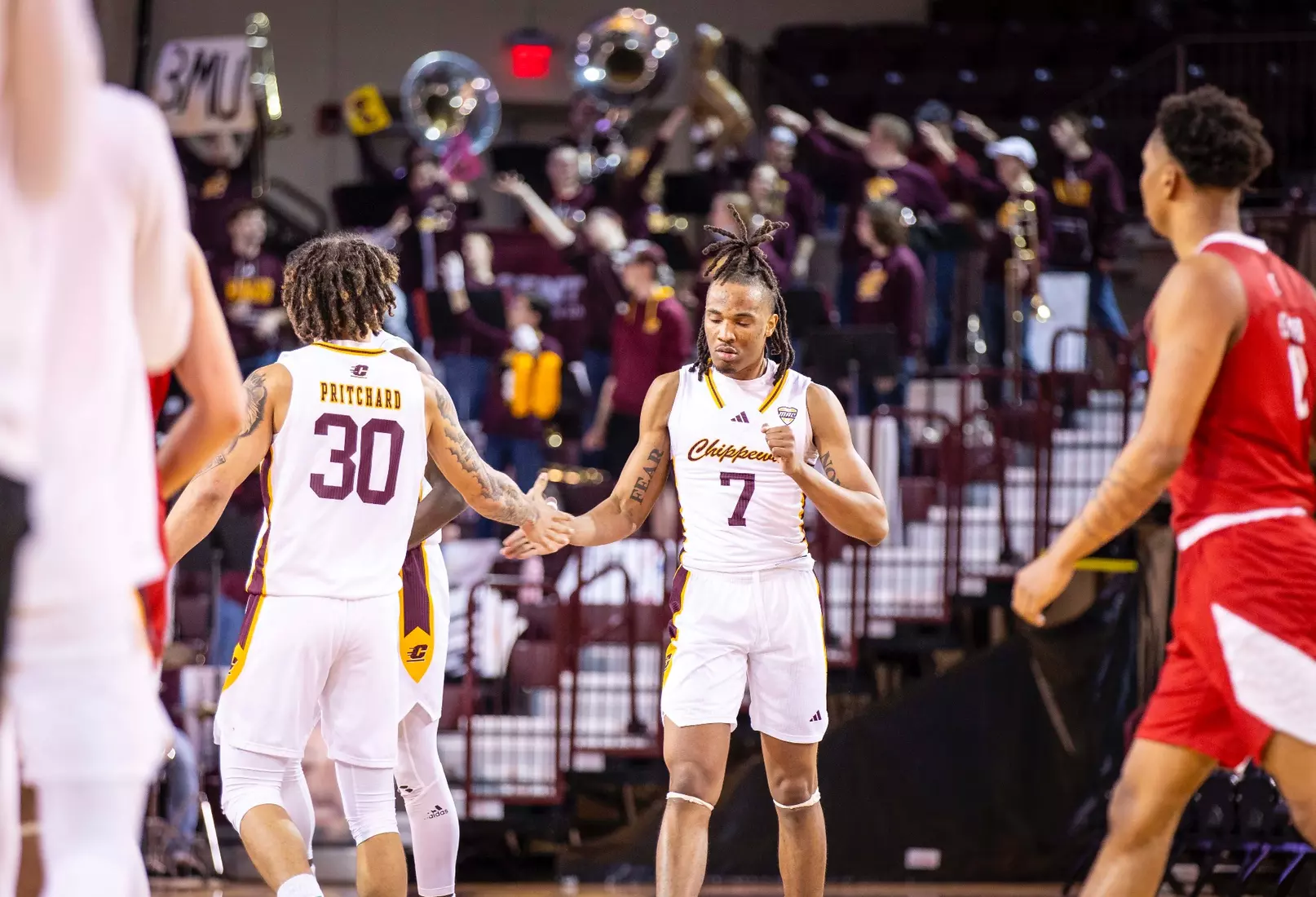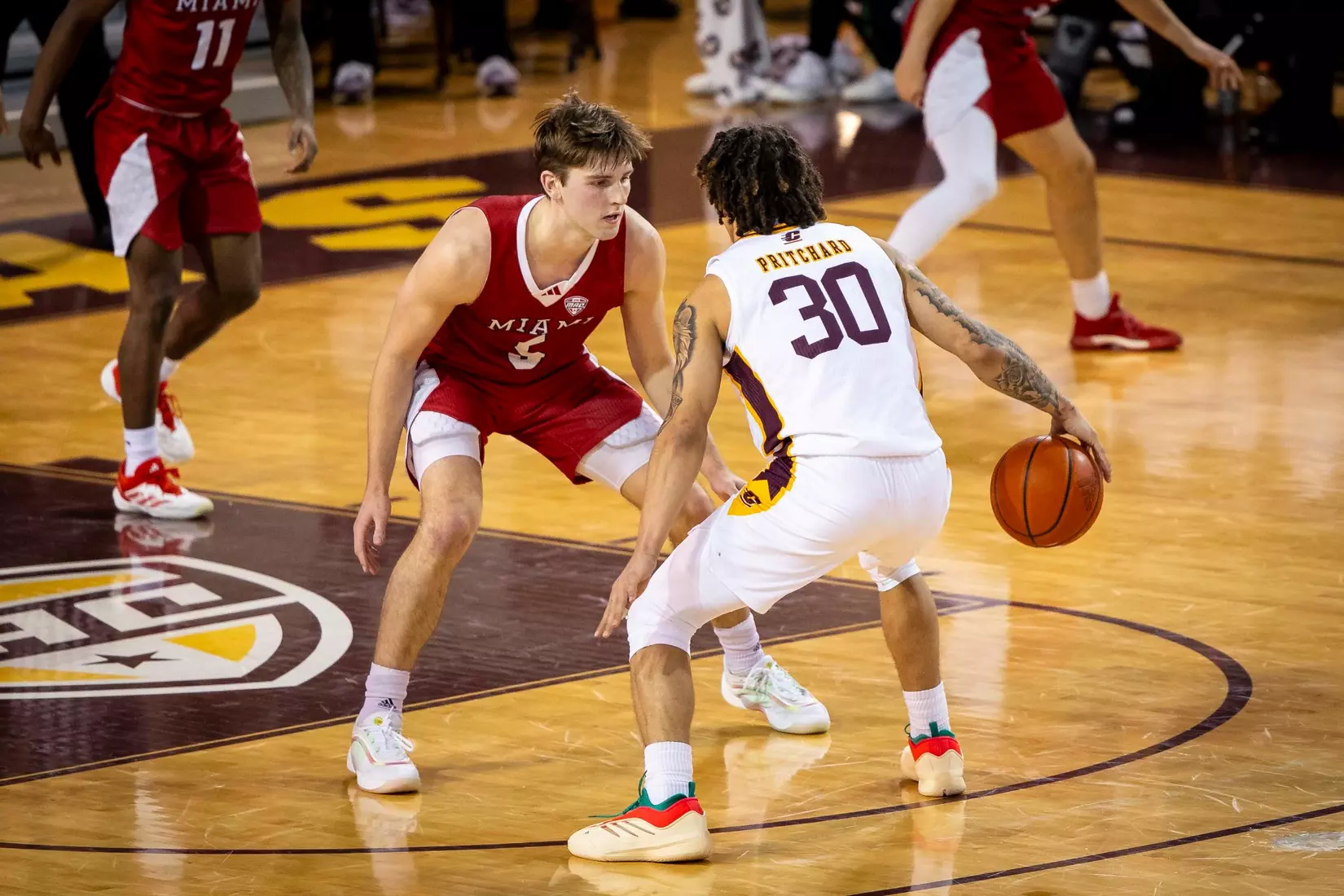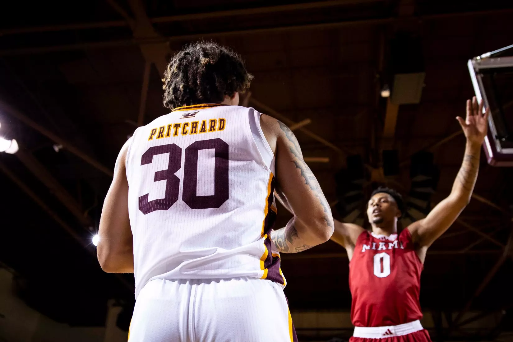 Trailing 37-34 at halftime, Central Michigan outscored Miami 10-3 to take a commanding 45-40 lead on a Jakobi Heady 3-pointer at the top of the key at the 15:30 mark. The Chippewas scored the second half's first four points to take its first lead of the game, 38-37, just two minutes into the second half. Later, Pritchard completed a behind-the-back pass to Jarusevicius for 42-40 lead with 16:52 to play. Then Heady made it 45-40.