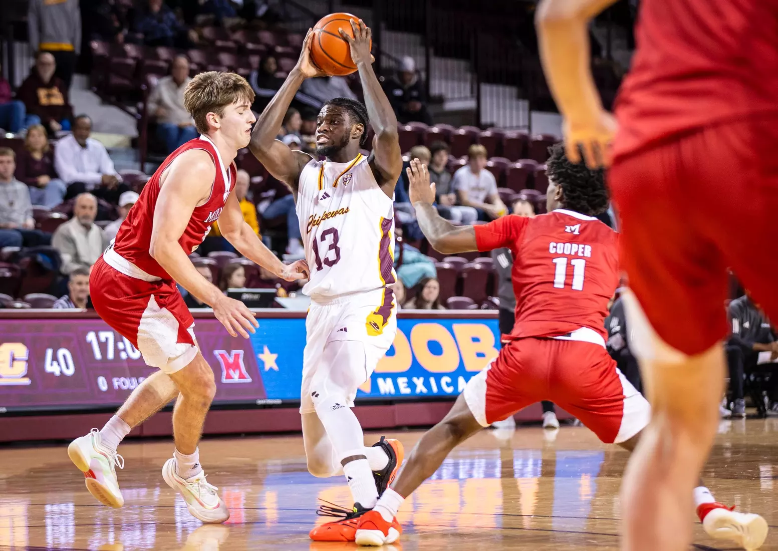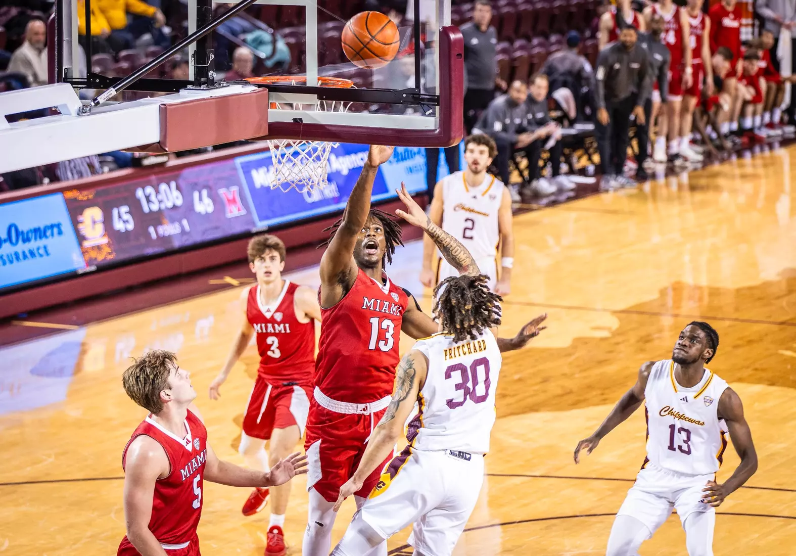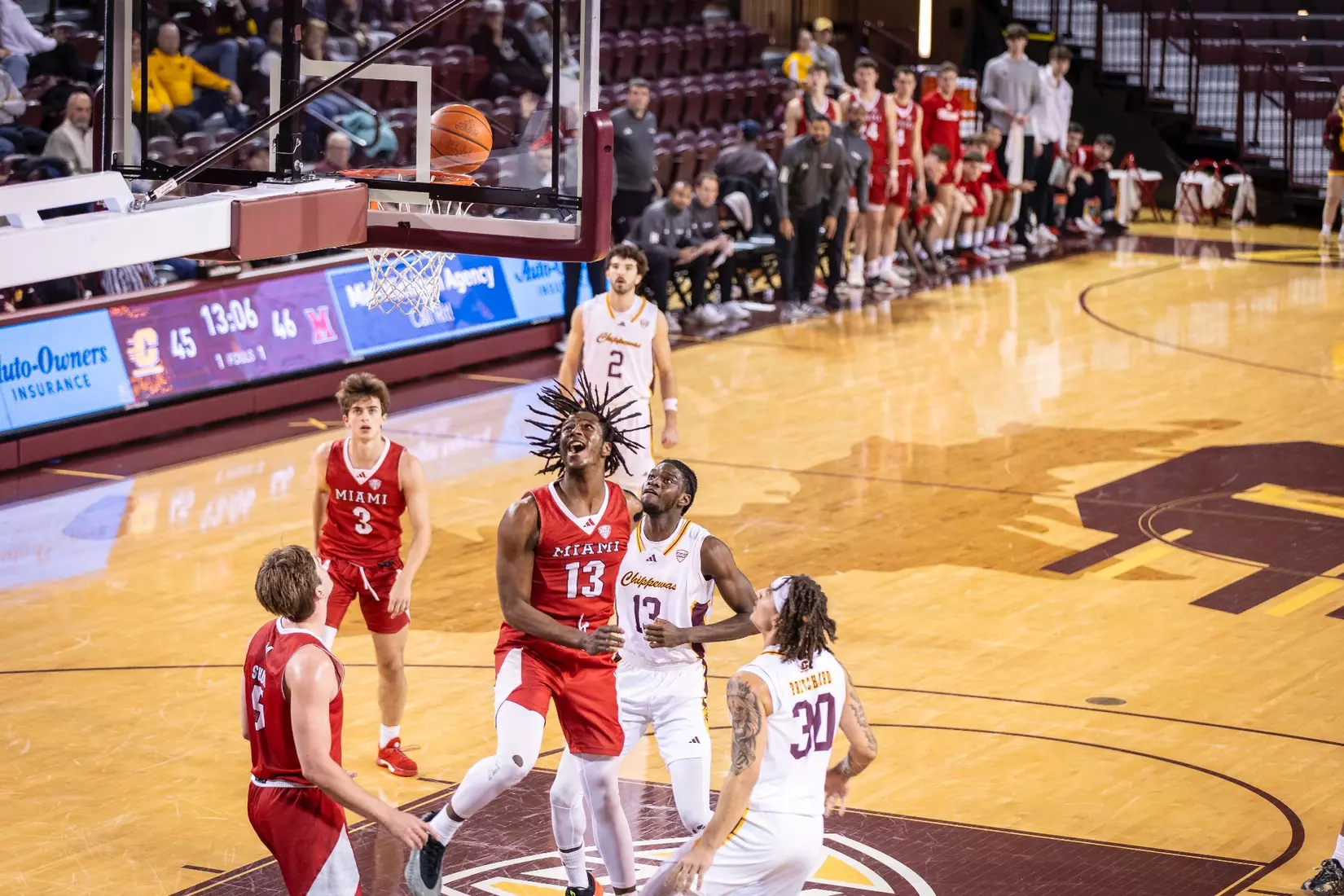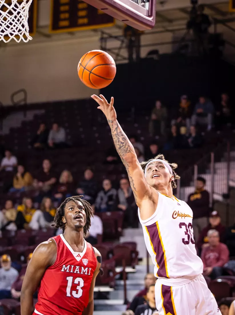 The Chippewas cut the margin down to four points, 28-24 with 4:04 to play in the first half when Kyler VanderJagt hit three free throws and Jakobi Heady finished off layup. Damarion Bonds hit a 3-pointer at the buzzer to cut Miami's lead to 37-34 at halftime. Peter Suder scored 13 points in the first half to lead Miami.