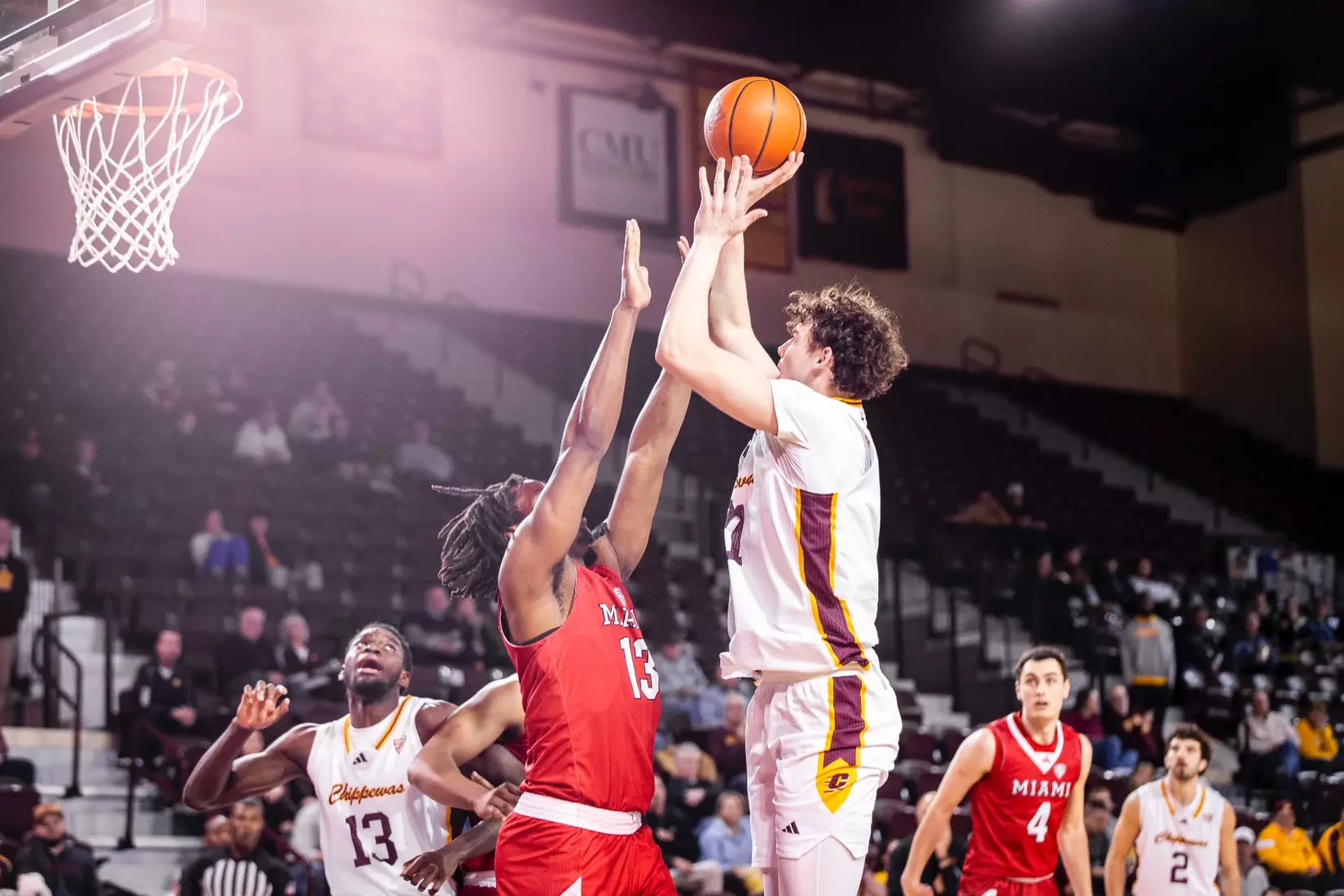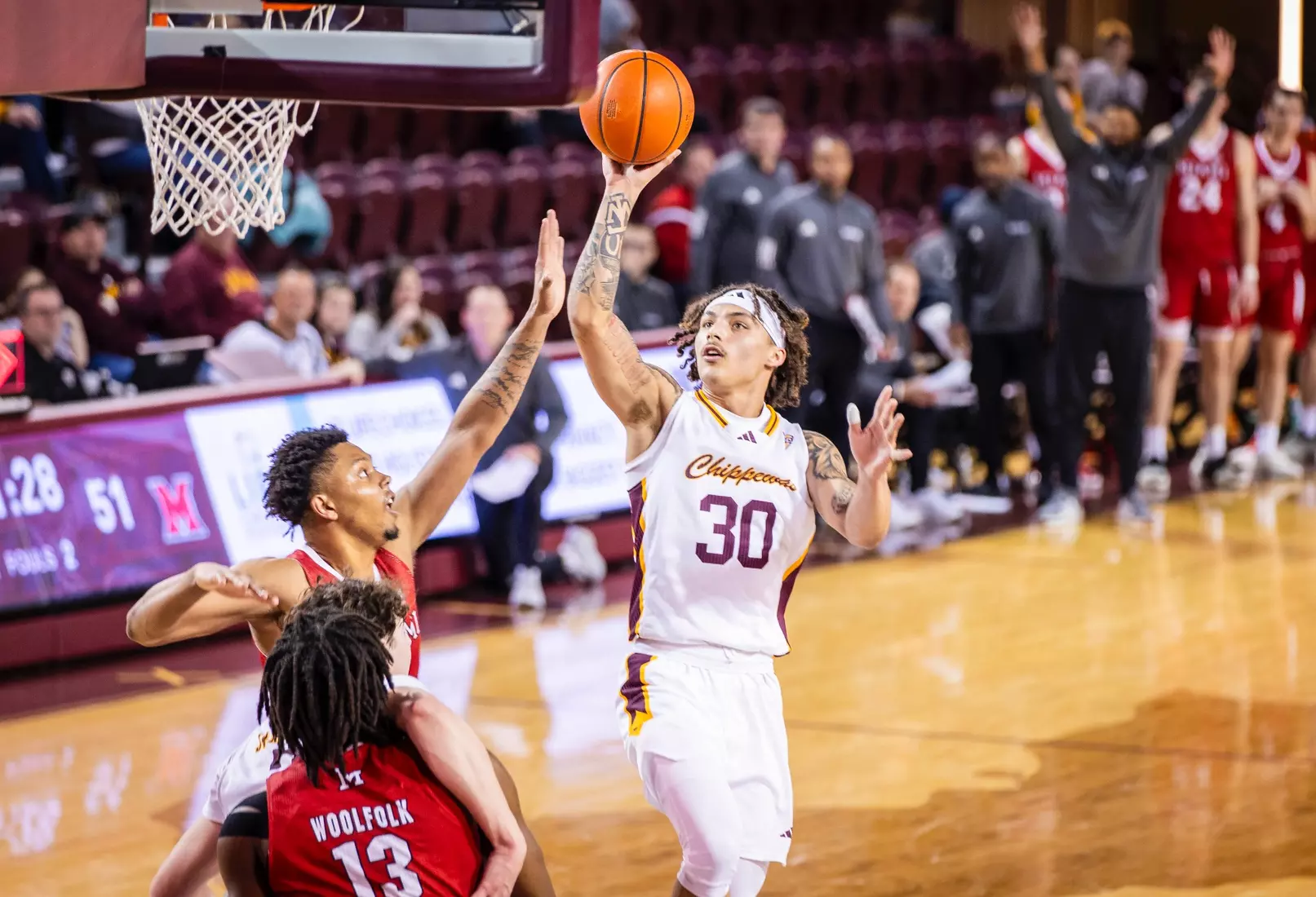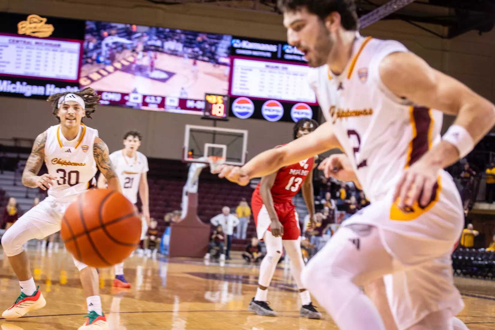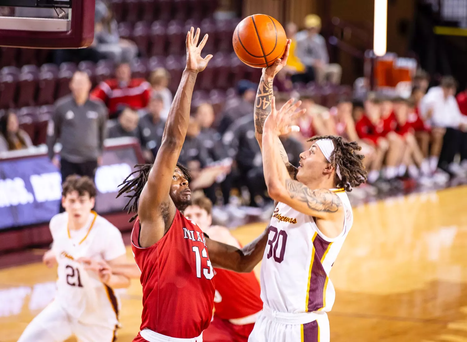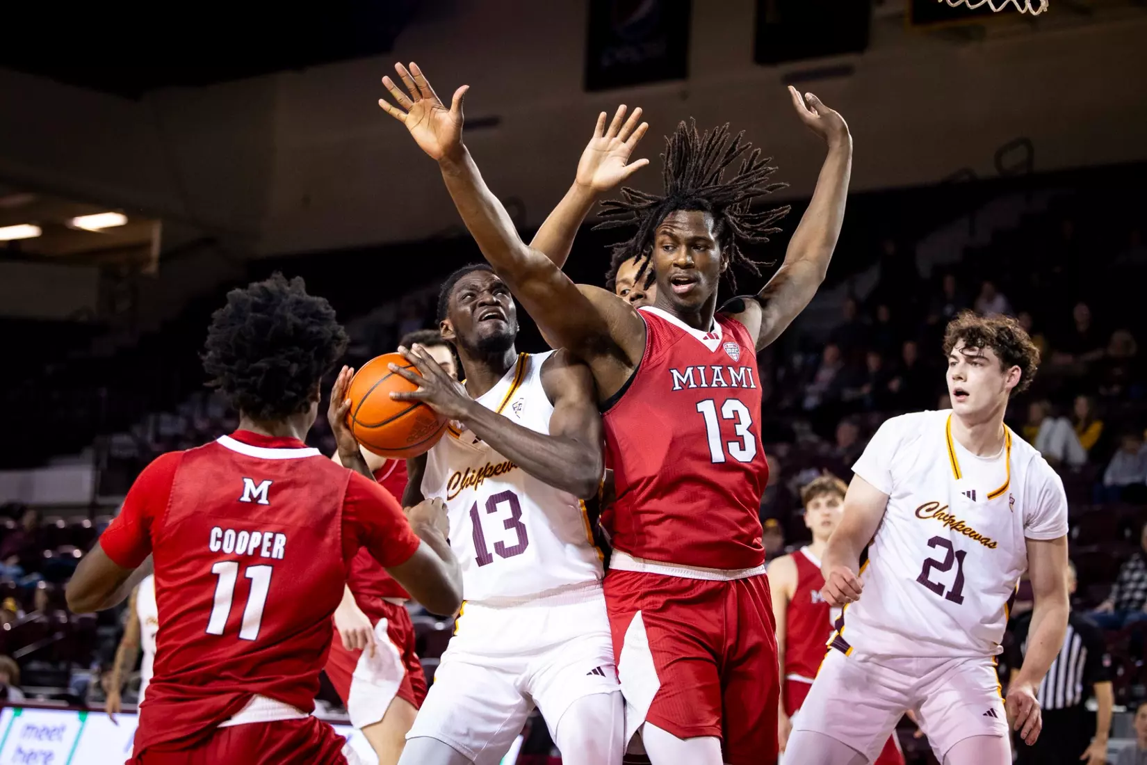 The Chippewas cut the margin down to four points, 28-24 with 4:04 to play in the first half when Kyler VanderJagt hit three free throws and Jakobi Heady finished off layup. Damarion Bonds hit a 3-pointer at the buzzer to cut Miami's lead to 37-34 at halftime. Peter Suder scored 13 points in the first half to lead Miami.