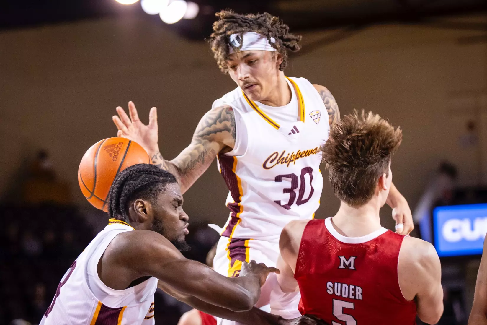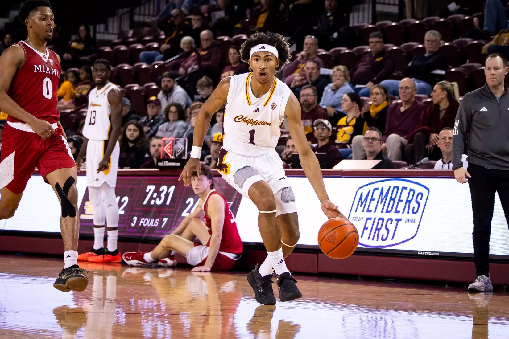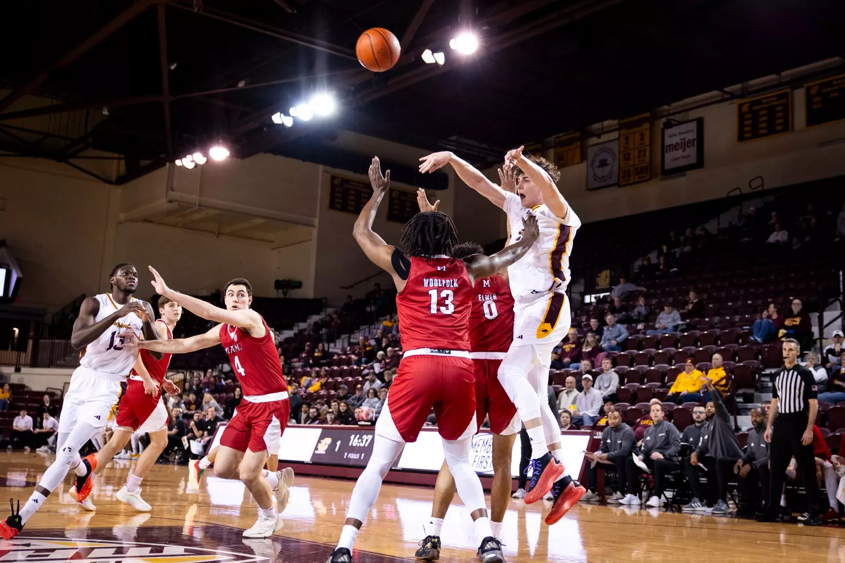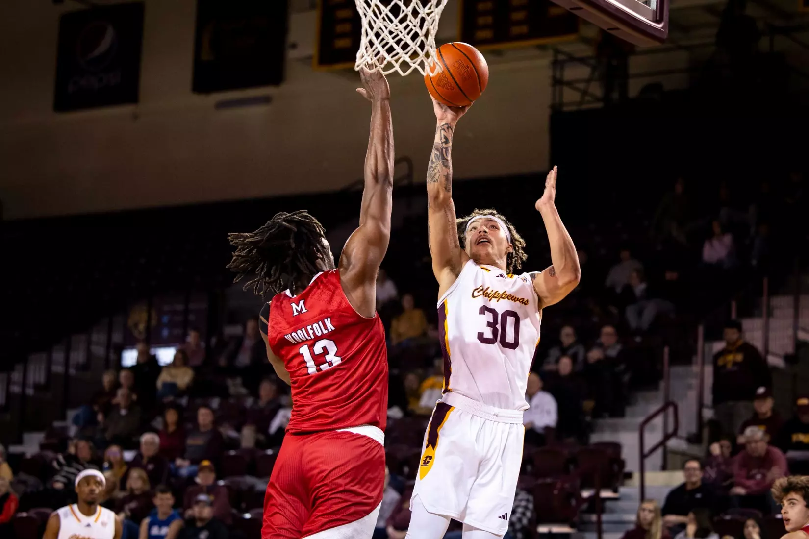 The Chippewas cut the margin down to four points, 28-24 with 4:04 to play in the first half when Kyler VanderJagt hit three free throws and Jakobi Heady finished off layup. Damarion Bonds hit a 3-pointer at the buzzer to cut Miami's lead to 37-34 at halftime. Peter Suder scored 13 points in the first half to lead Miami.