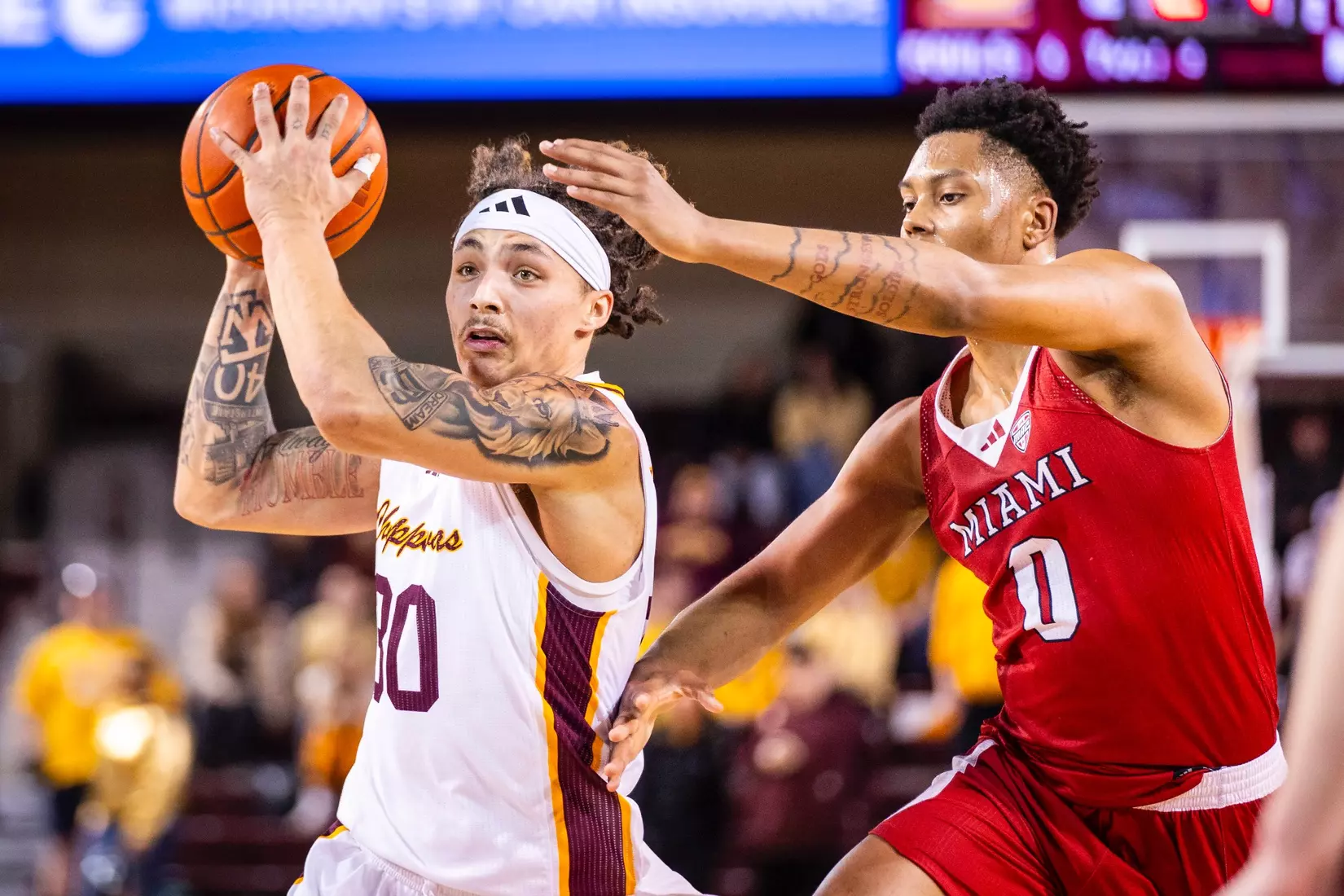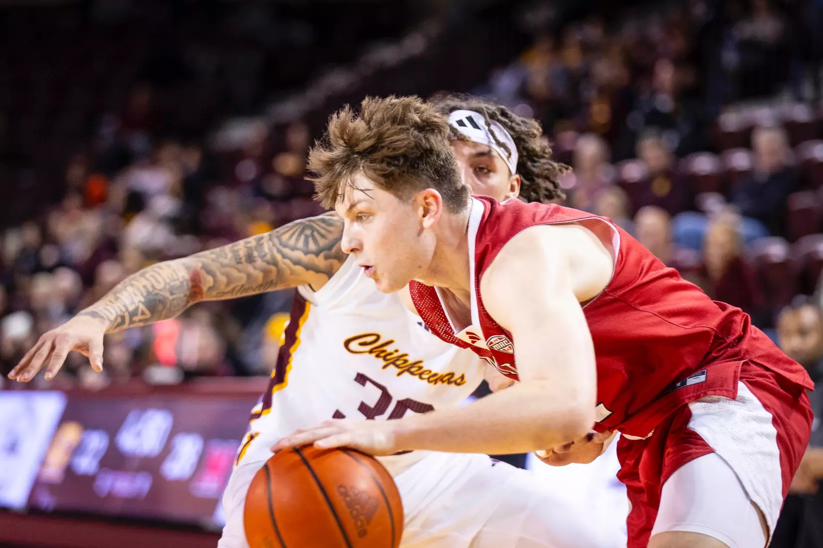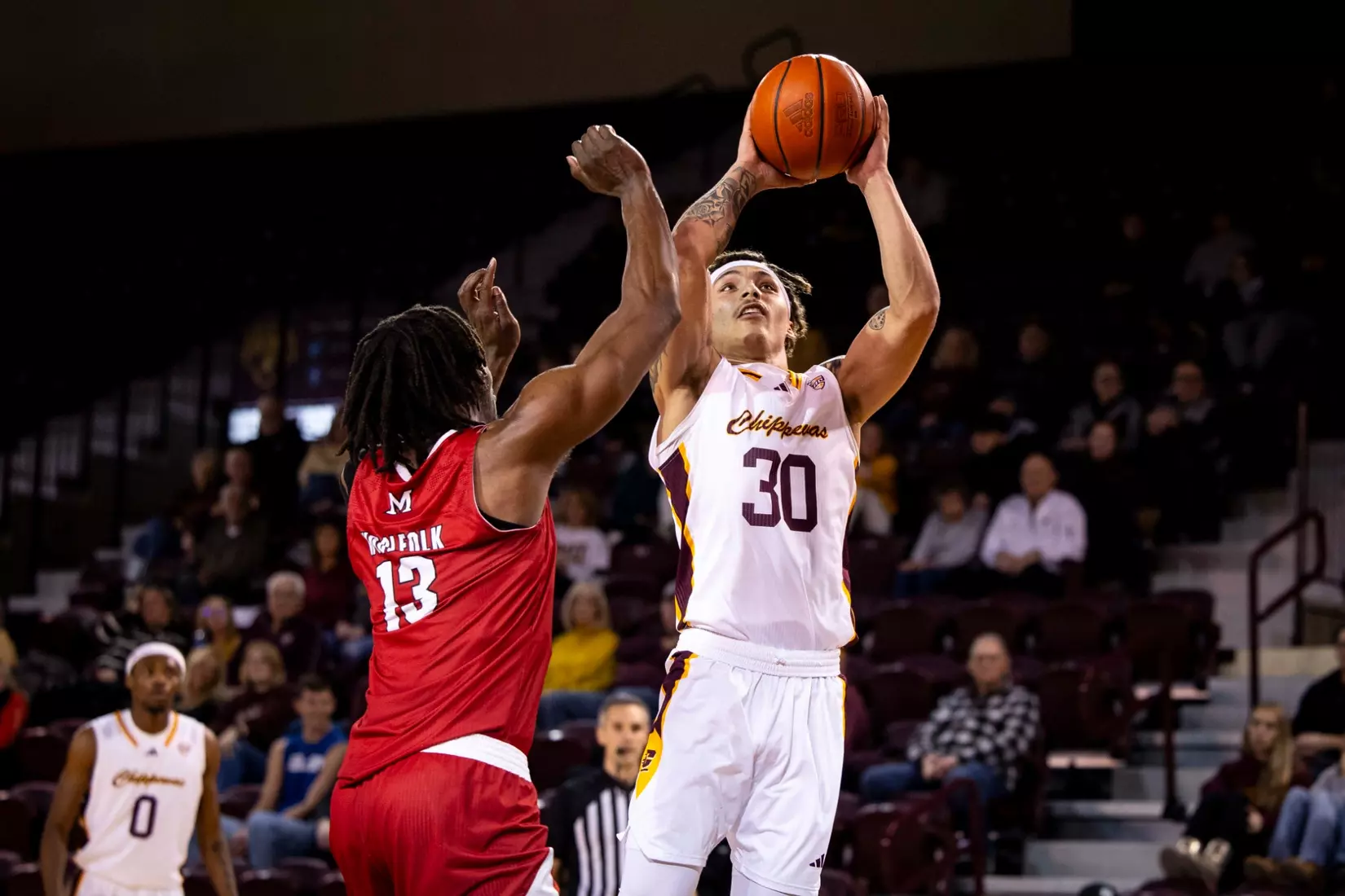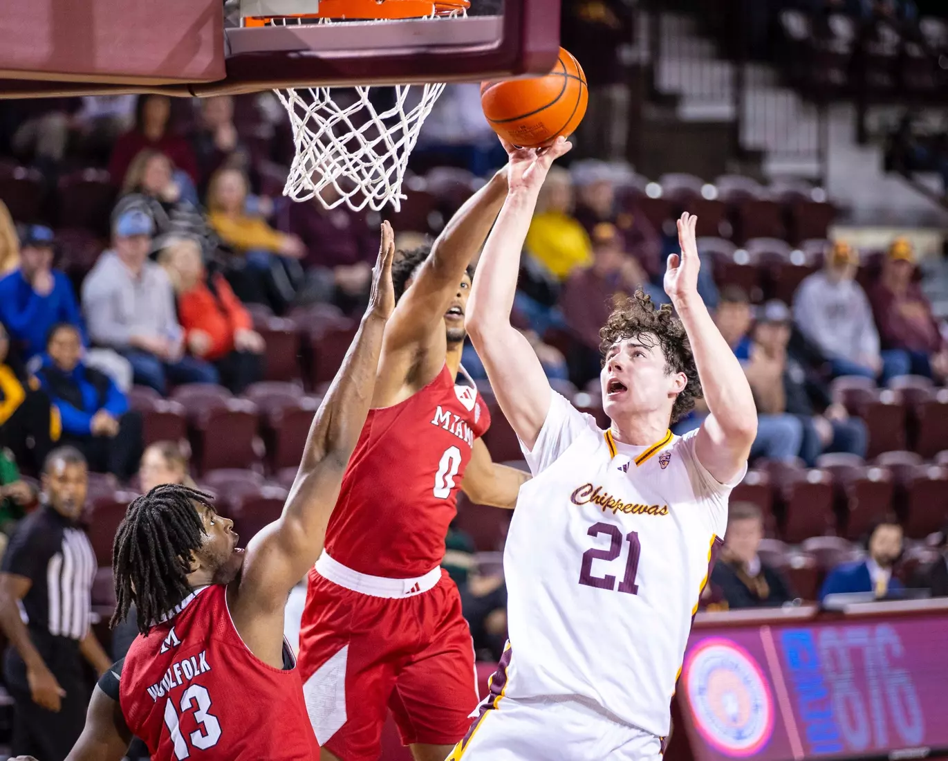 The Chippewas cut the margin down to four points, 28-24 with 4:04 to play in the first half when Kyler VanderJagt hit three free throws and Jakobi Heady finished off layup. Damarion Bonds hit a 3-pointer at the buzzer to cut Miami's lead to 37-34 at halftime. Peter Suder scored 13 points in the first half to lead Miami.