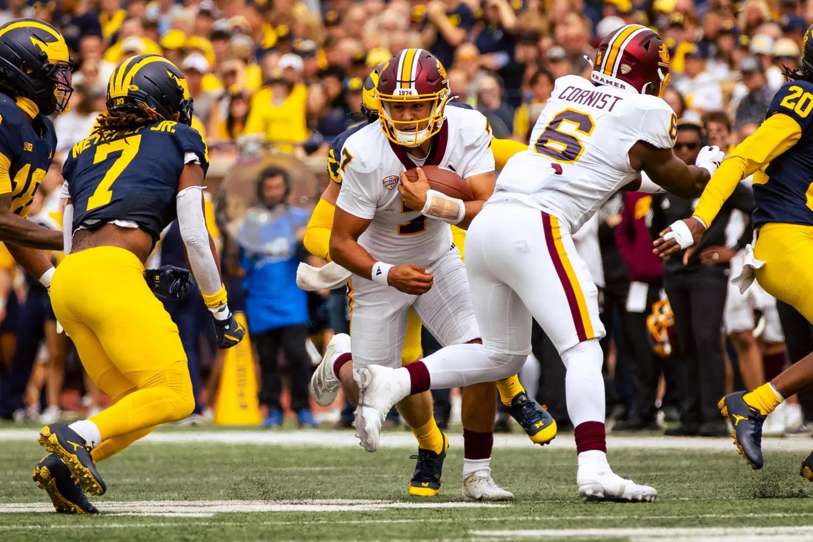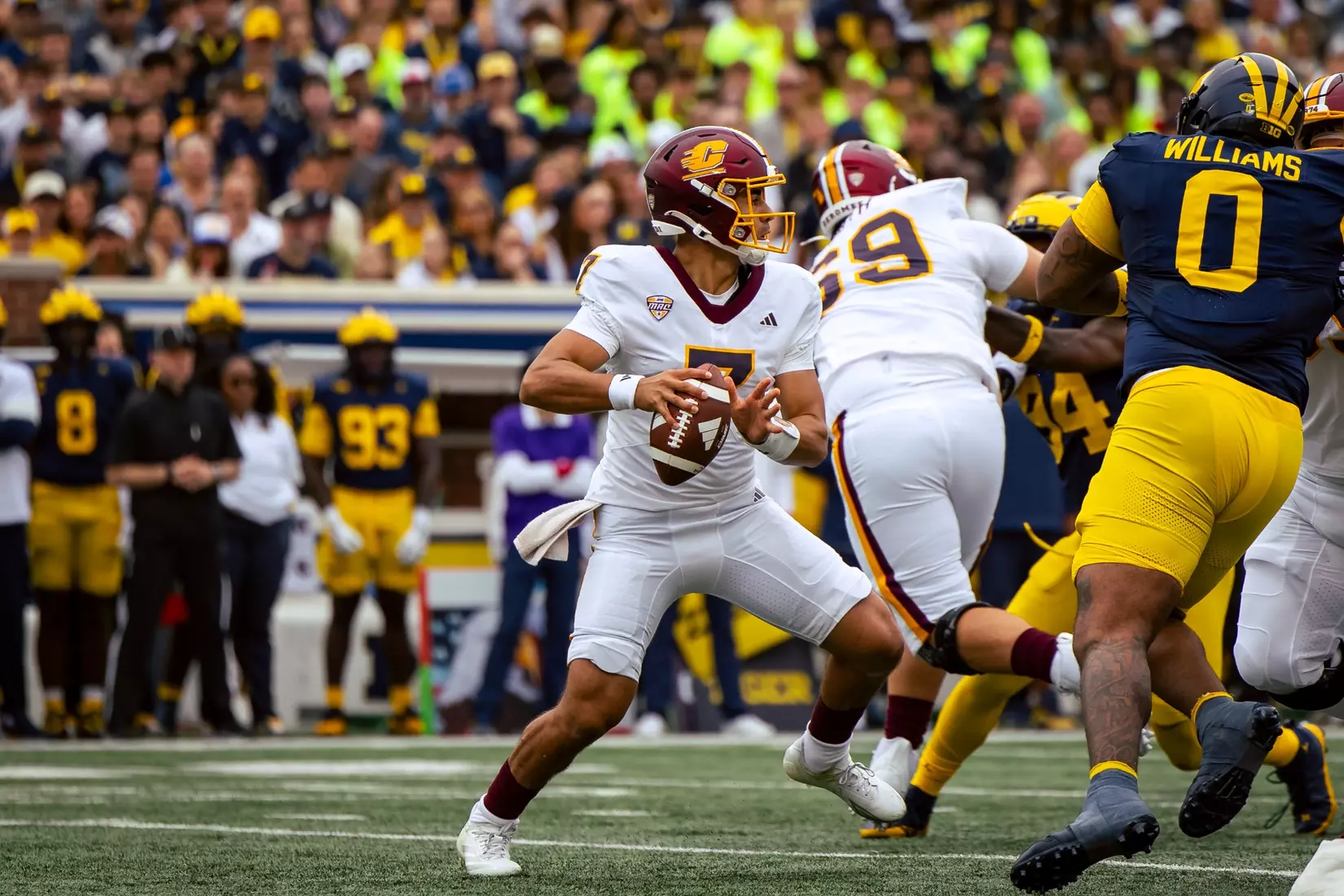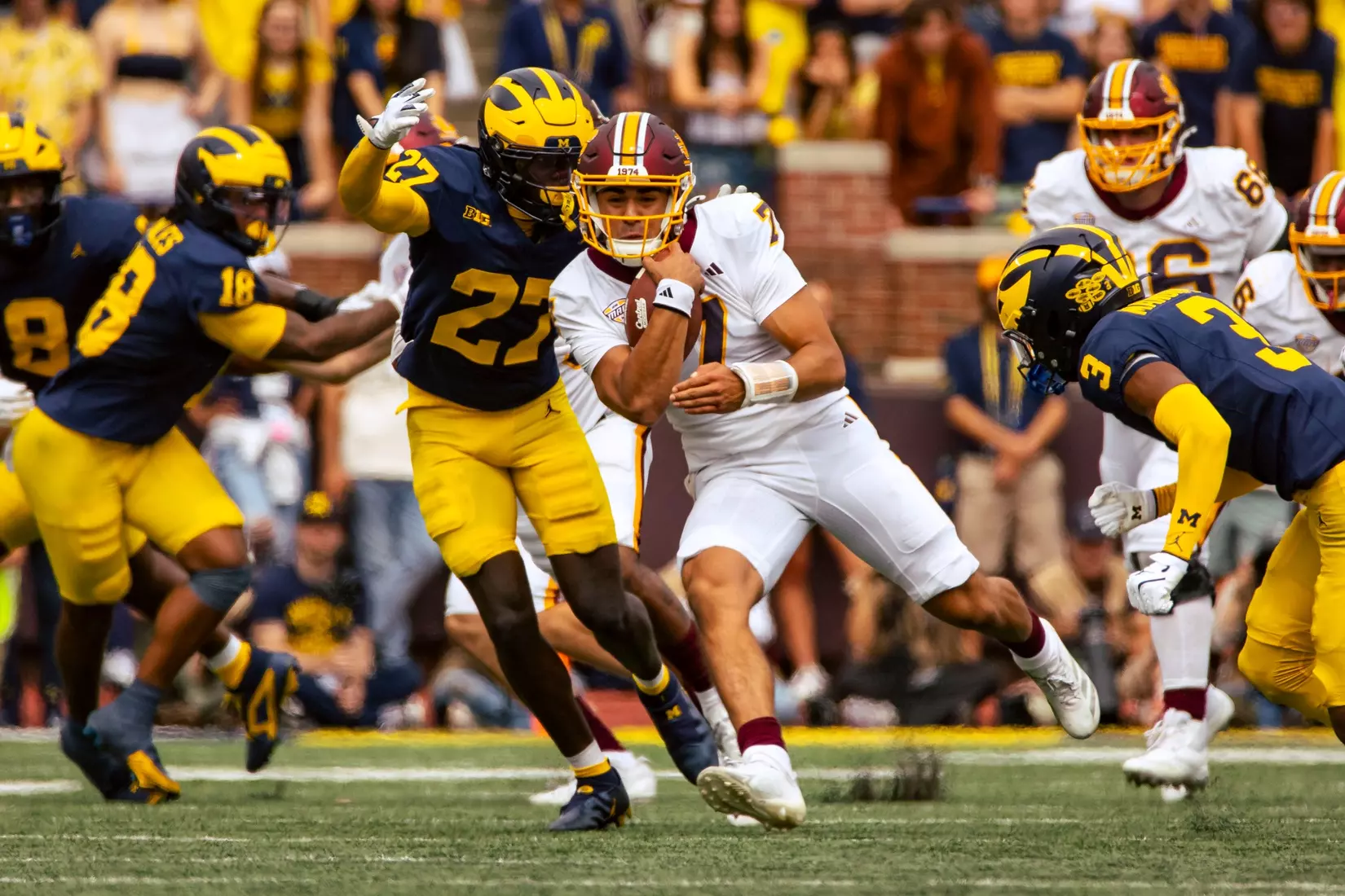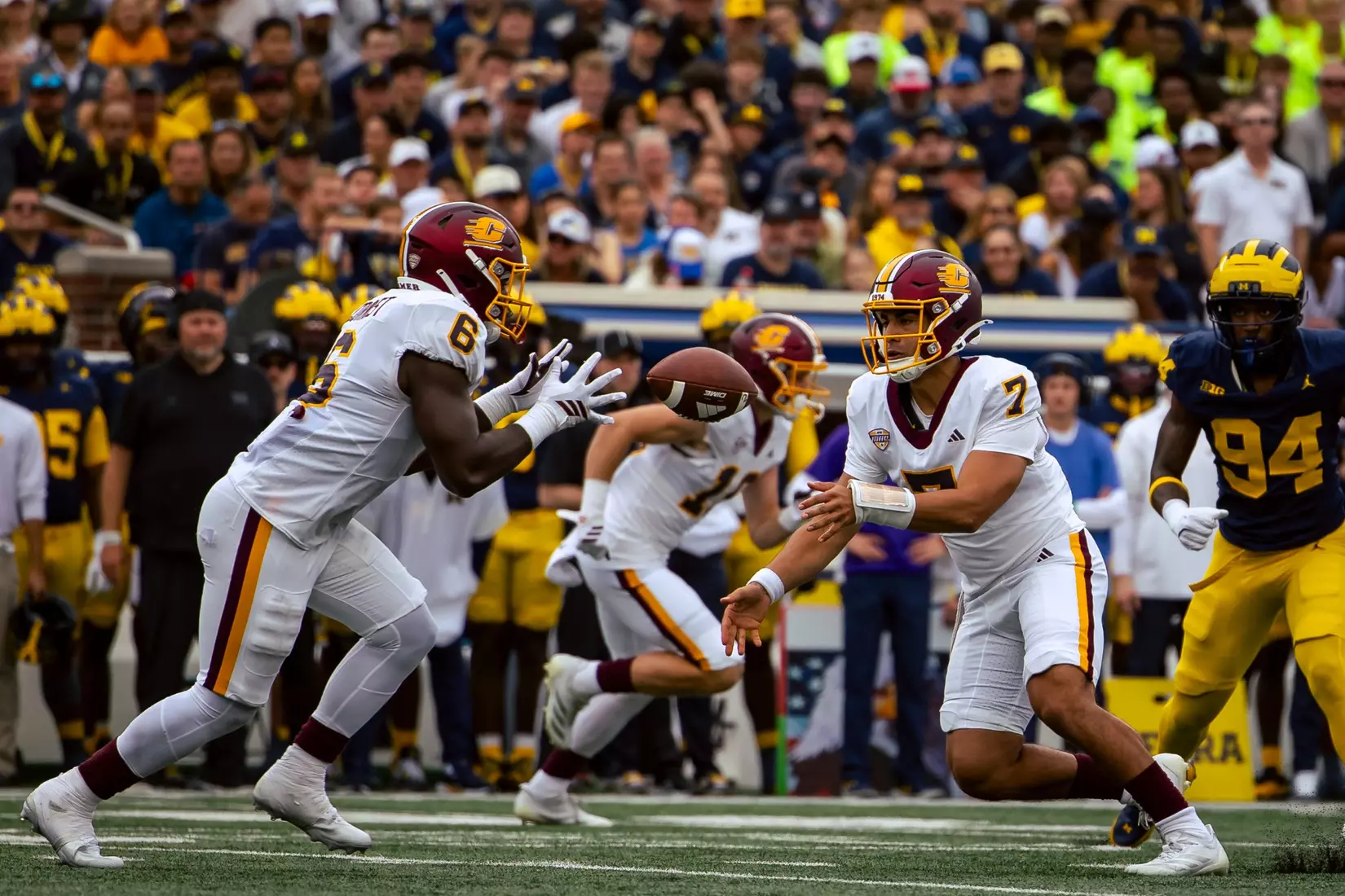 The No. 22-ranked Wolverines rolled up 616 yards of total offense on Saturday in handing Central Michigan a 63-3 nonconference loss before 110,740 at Michigan Stadium.