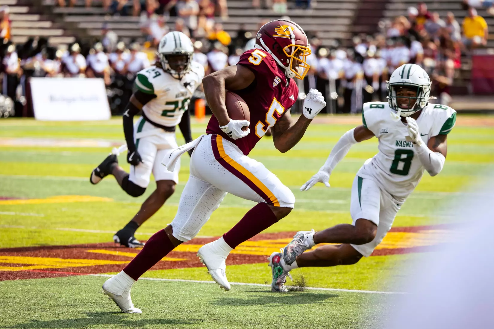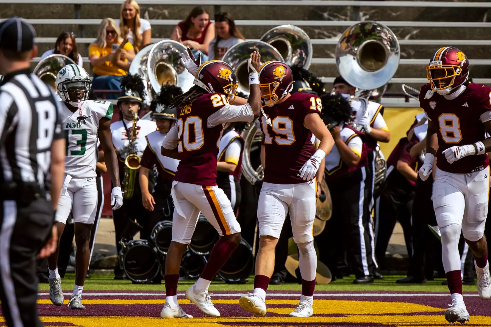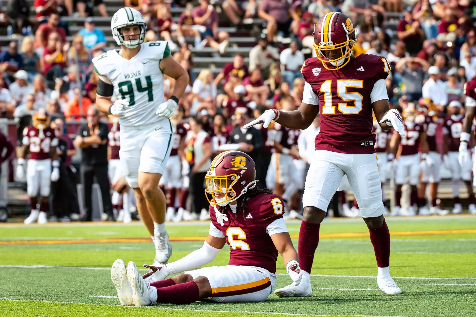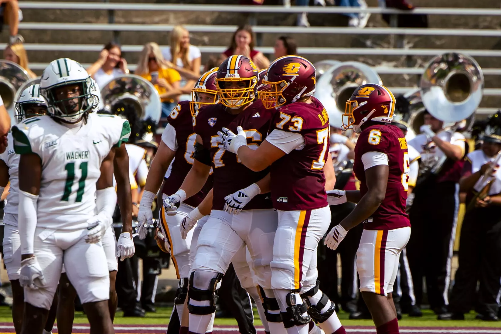 CMU quarterbacks throw four TD passes; Chippewa offense produces 504 yards; Chippewa defense holds Wagner to 113 yards.
