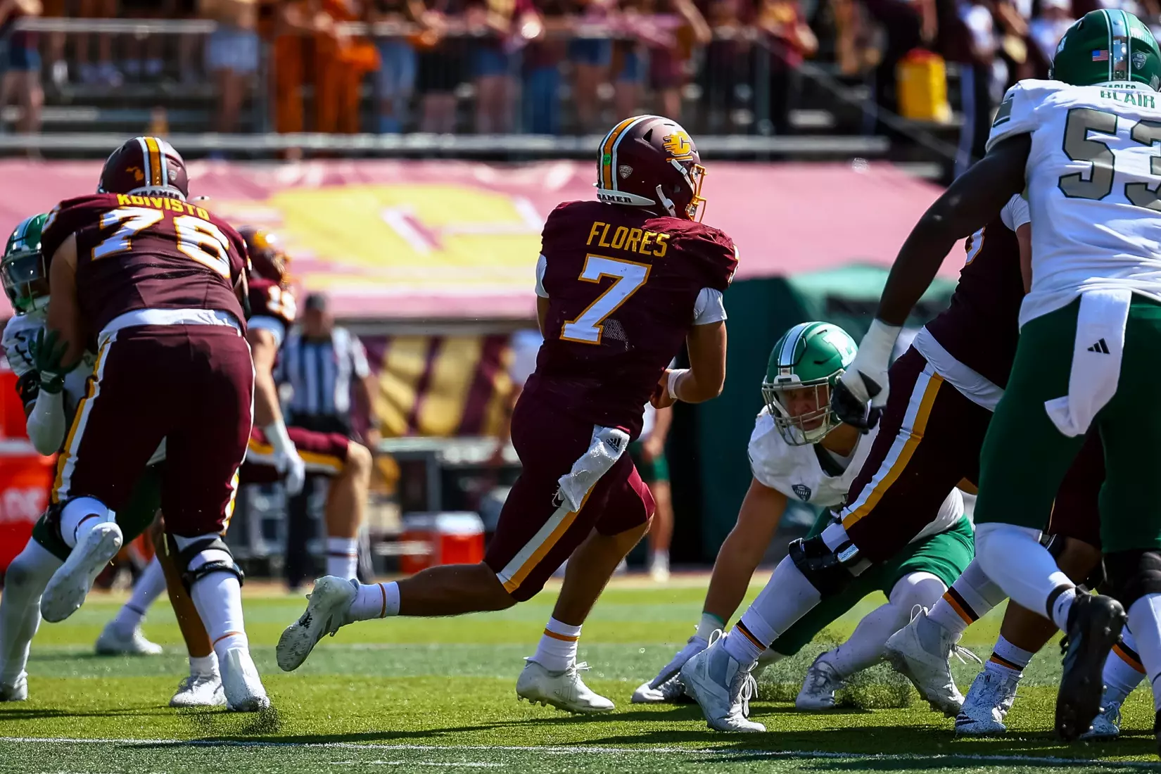 Flores did much of the damage on his own on the game-clinching drive, carrying six times for 40 yards. With the Chippewas facing a fourth-and-1 at the EMU 37, Flores hit the line and broke to the outside for a 12-yard run for a first down.