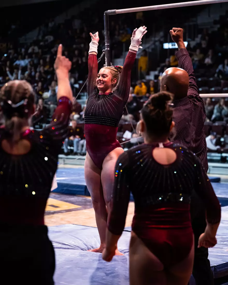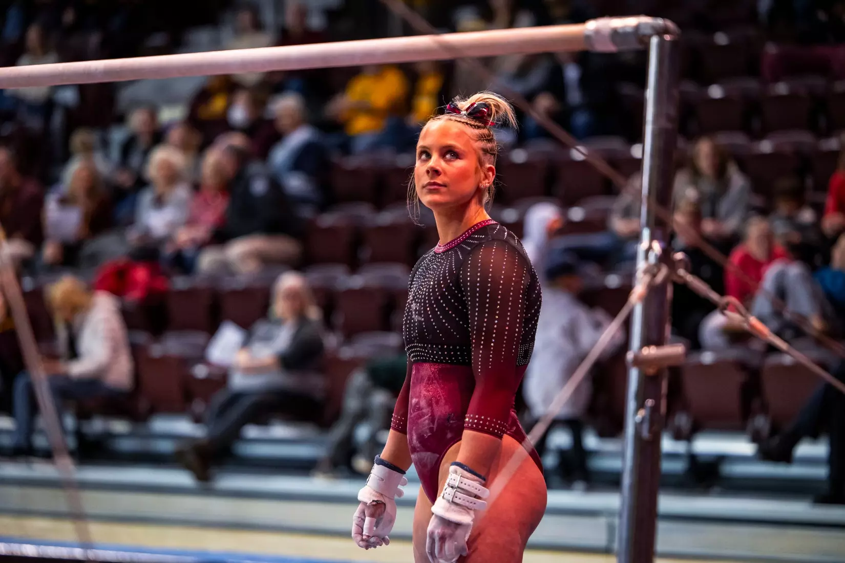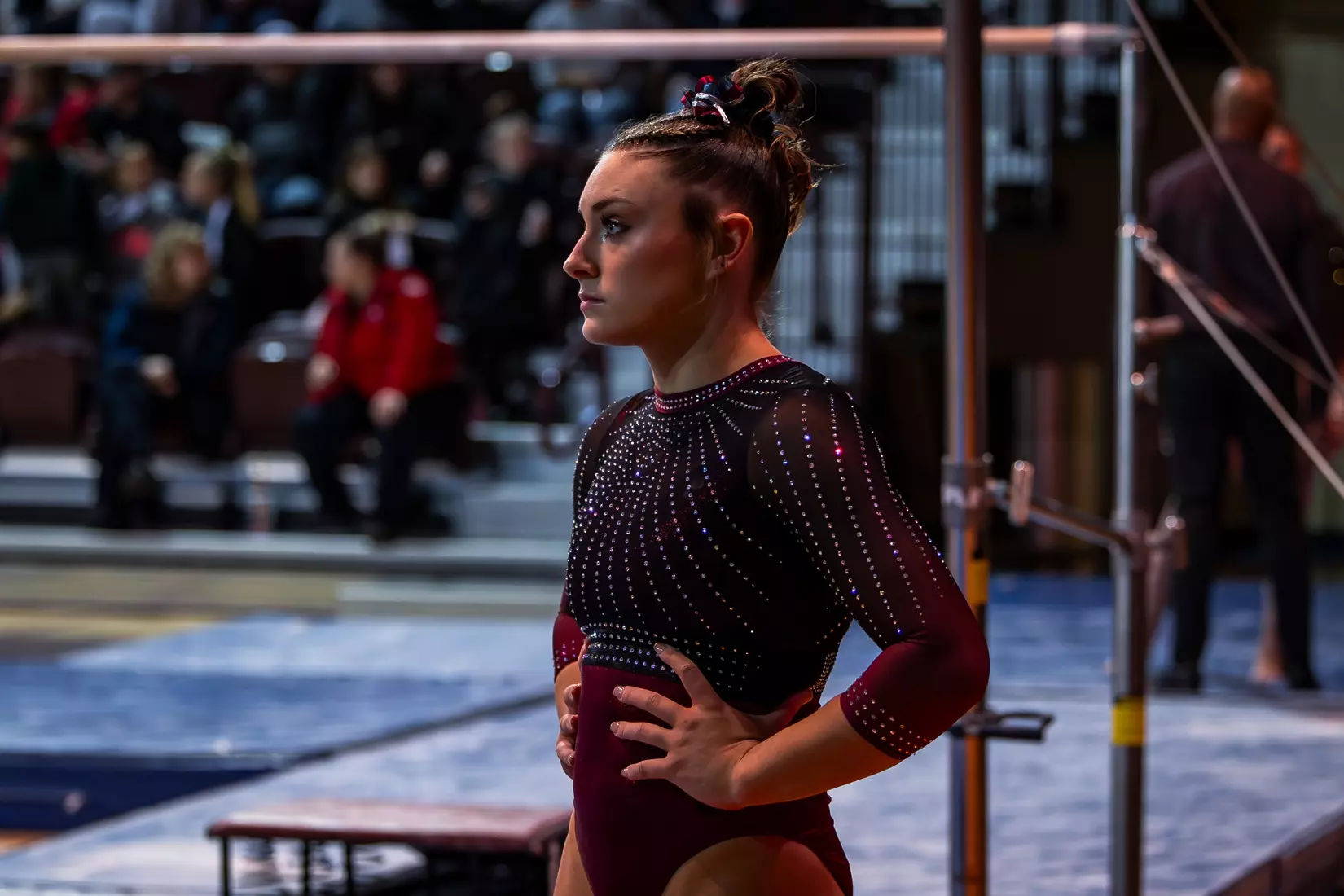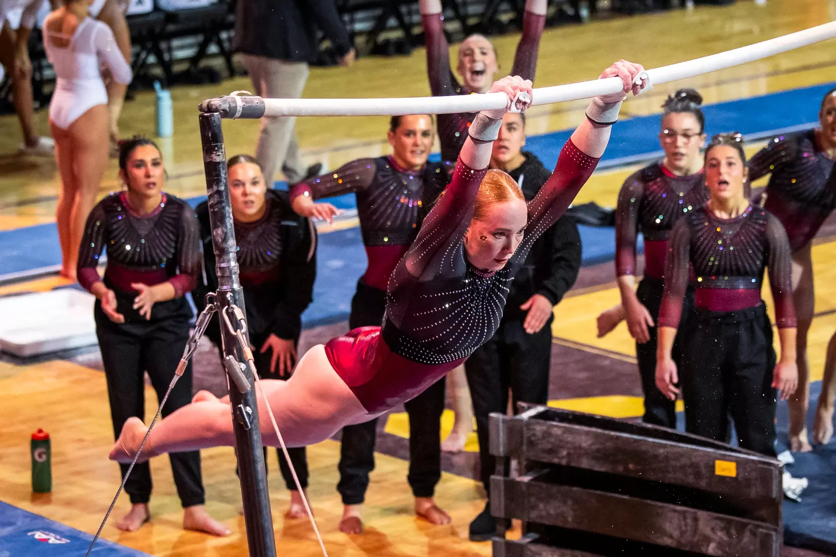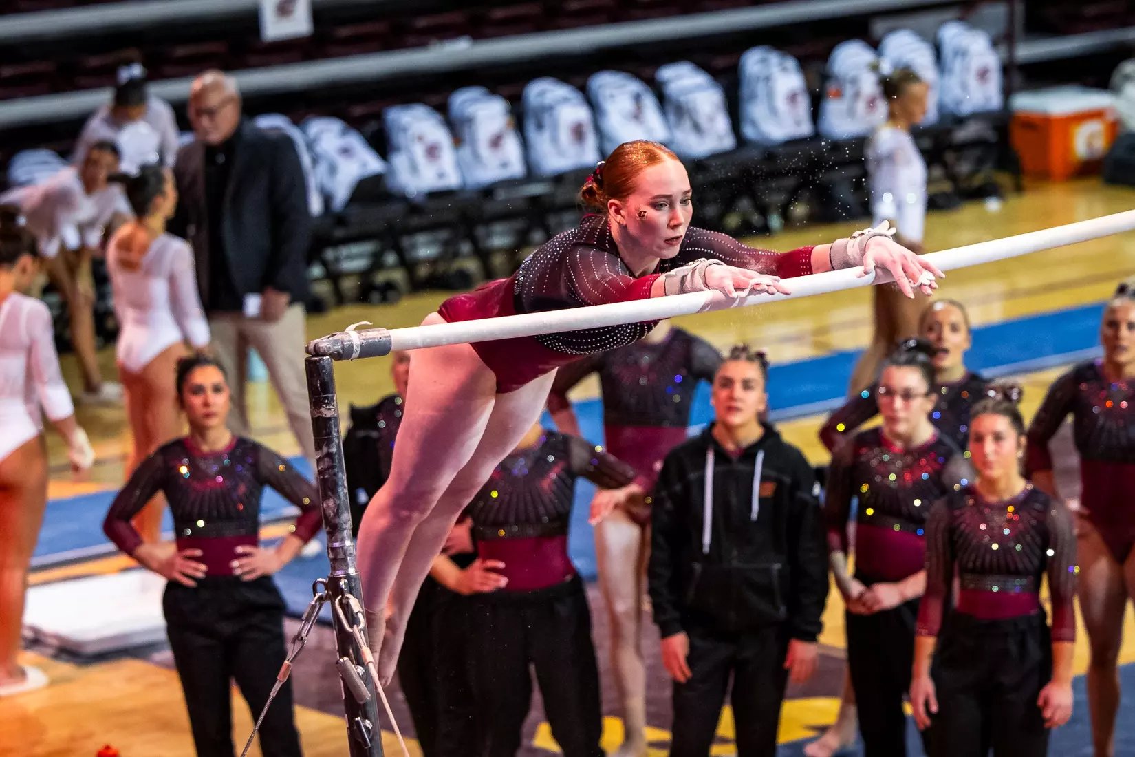 Lia Kmieciak tied her career-best to win bars with a 9.900 and Luciana Alvarado-Reid placed second with a 9.850. Ava Wellmeier and Kaitlyn Schwab tied for third, each scoring 9.825, and a new career-high for Wellmeier.
