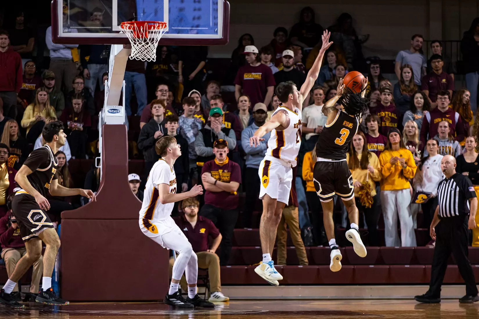 Claerbaut (10 points and eight blocks) and Brooks (10 points), sparked the Chippewas in the first half as they built a 40-33 halftime lead. Central Michigan used a 9-0 run to take a 17-10 lead at the 11:01 mark. Adley scored on a layup, Mullen converted a fast break layup, a Brooks steal led to a layup, and Mullen banked in a 3-pointer as the shot clock expired.