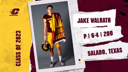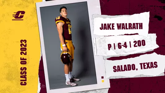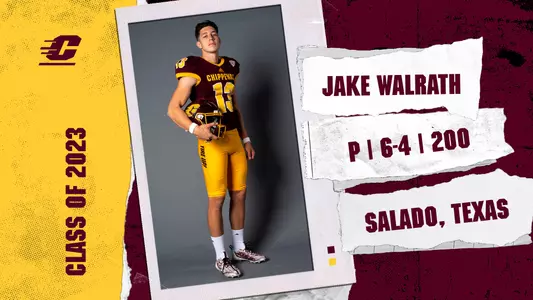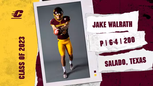 Born Louis Jake Walrath on August 27, 2000 in Killeen, Texas … Son of Jason and Kathi Walrath … Father Jason is a retired Army General, who attended Army West Point … Has a younger sister Olivia … Role models are his mother and father, who demonstrated a blend of hard work, honestly, preparedness, kindness, and compassion … Hobbies and interests include hiking, hunting/fishing, ping pong, shooting skeet and trap, and grilling… Has bartended at a brewery in Birmingham, Ala. during summers … Visited Central Michigan on December 9, 2022 … Selected Central Michigan to play for the coaching staff, the opportunity, the family feel of the program, and college town location … Chose Central Michigan over offers from Texas, Baylor, Arkansas, Oregon State, Troy, Georgia State, Connecticut, and Bowling Green … Majoring in kinesiology.