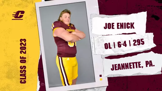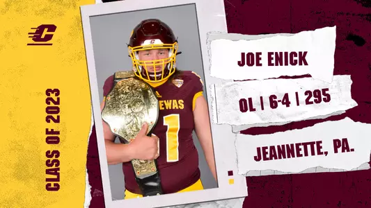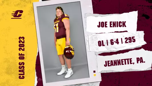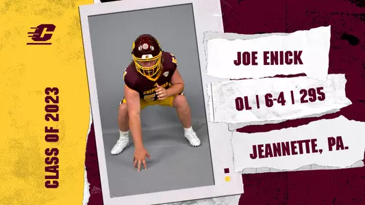 Born Joseph Baptista Enick on October 21, 2004 in Jeannette, Pa. … Son of Michael and Tera Enick … Has a younger sister Gianna … Father attended West Virginia and mother attended Pitt … Father played football on the offensive line (center) at West Virginia from 1996-2000 … Hobbies and interests include hunting, fishing, trail riding … Worked summer jobs as a landscaper and tree cutter …Role model is his grandfather and father because of the hard work and sacrifice they have taught him …Favorite sports memory was defeating Pine-Richland in the state semifinals … Fell in love with the Mid-Michigan area because of the hunting and fishing options … Selected Central Michigan to play football, get a good education and pursue a future career … Also selected Central Michigan because he loved the people and coaches and it feels like a big family and home away from home … Committed to CMU on June 6, 2022 … Selected Central Michigan over offers from Buffalo, Miami, Ohio, Eastern Michigan, St. Francis (Pa.), The Citadel, Georgetown, Lehigh, Bucknell, Youngstown State, Albany, Duquesne, Maine, and Monmouth … Future plan is to become a state police officer.